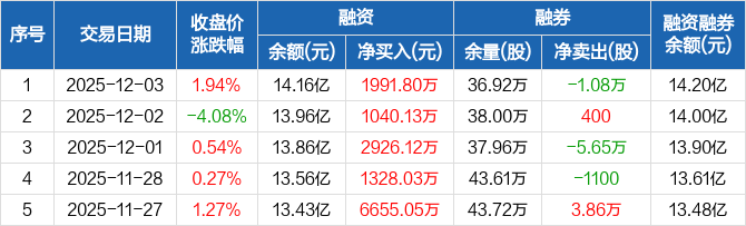 融资方面,当日融资买入1.7亿元,融资偿还1.5亿元,融资净买入1991.8万元,连续5日净买入累计1.39亿元。融券方面,融券卖出3.05万股,融券偿还4.13万股,融券余量36.92万股,融券余额406.86万元。融资融券余额合计14.2亿元。