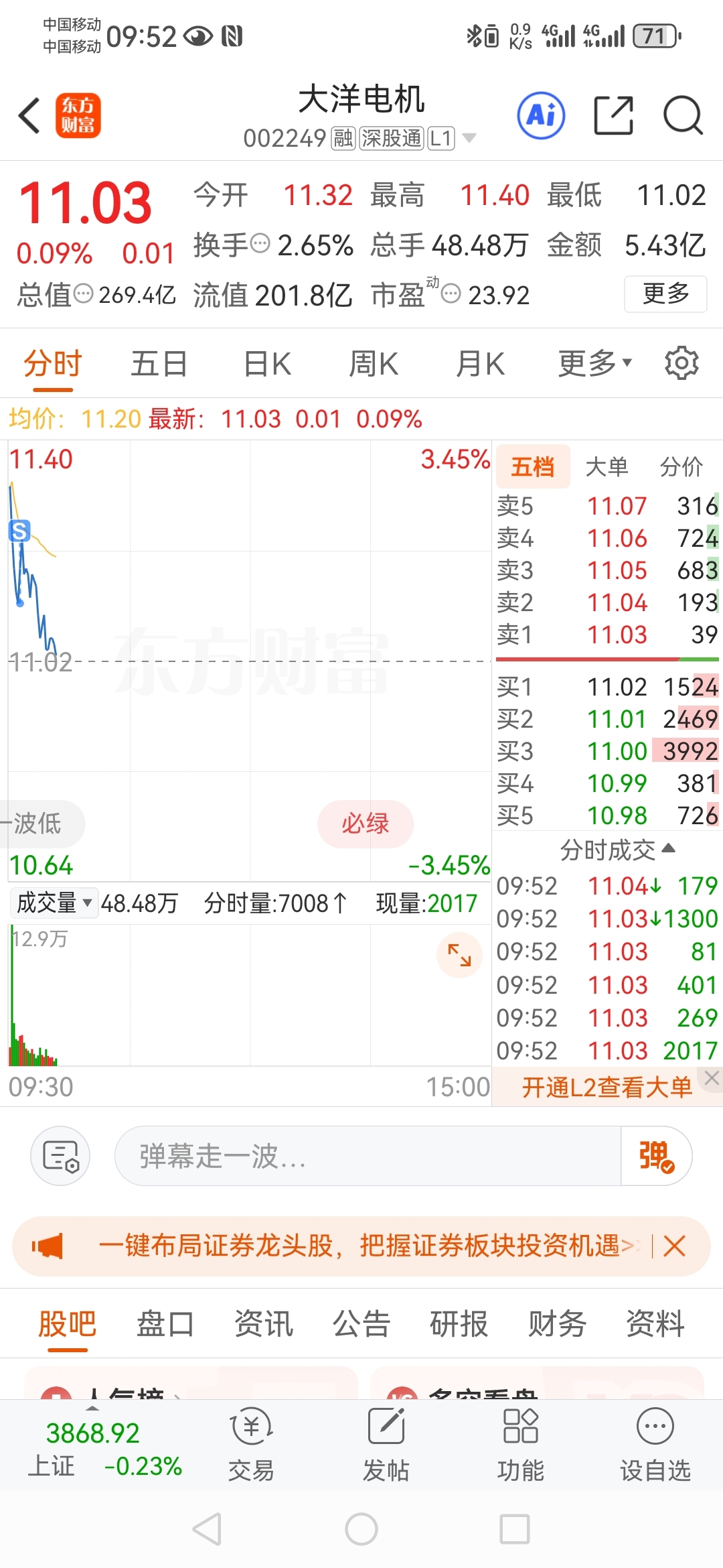 $大洋电机(SZ002249)$ 开局就三秒,顶不住啊,卖飞就卖飞吧。我去另一个机器人