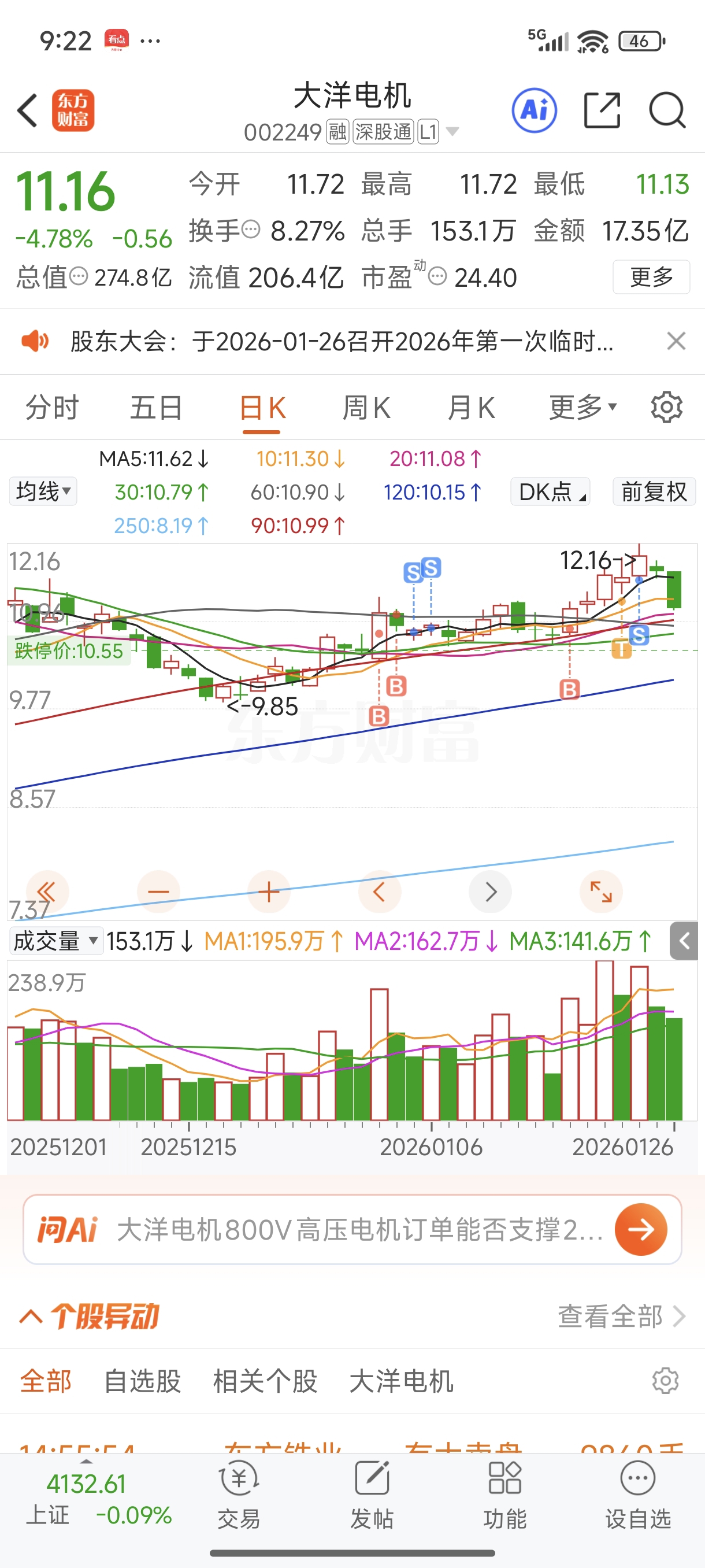 $大洋电机(SZ002249)$ 上周四卖飞还懊恼了一会