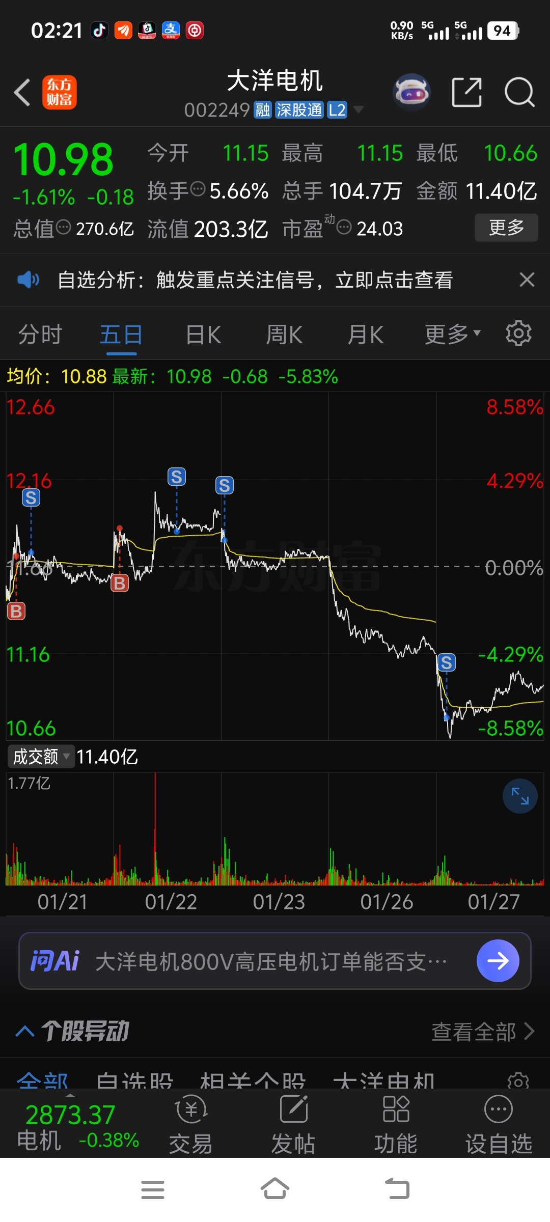$大洋电机(SZ002249)$ 反思一下,强烈看好,到落荒而逃。今天最后一手清仓,亏一个点,主力资金砸盘坚决,年前许多股的主力要砸坑了,为春季行情做准备。年前要降仓位了,进入休闲时间。#炒股日记# #实盘记录#