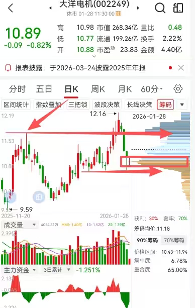 $大洋电机(SZ002249)$ 上周四尾盘集合竞价接的,本想搏个突破前高加速,第二天便打脸,亏三个点盘中止损,昨天回到前期低位平台止跌,今天没打昨天低点,配合筹码顶峰位置,10.81再进场试错一次。