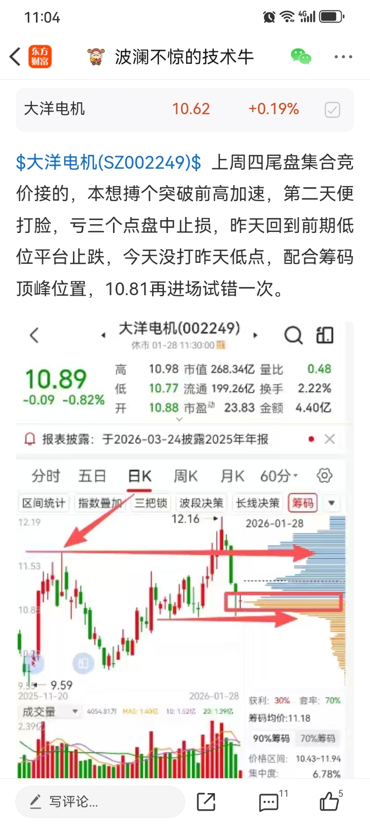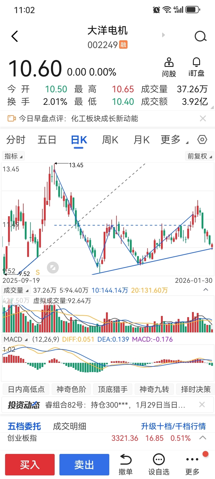 $大洋电机(SZ002249)$ 今天第三次10.43进场试错,原因打到短期双底支撑,也是布林下绿区域,配合人形机器人板块走势,看冰点反弹,重要说三遍:只看反弹。第一次进场搏突破加速失败亏2个点止损,第二次前横盘区进场搏反弹保本出来,我们不猜涨跌,只根据当前量价线应对,不断试错,对了吃肉,错了马上纠错止损