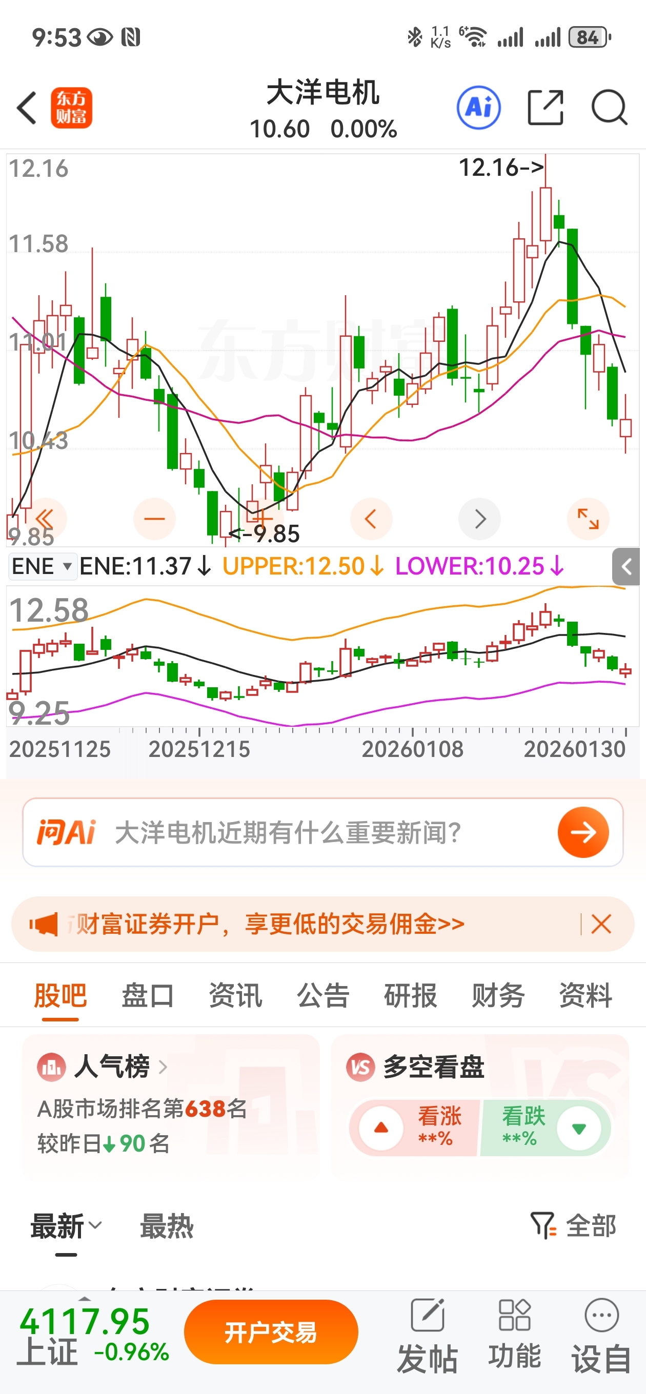 $大洋电机(SZ002249)$ 上轨12.16-11.58=0.58。下轨9.85+0.58=10.43元。下星期极限挑战,上下主力说了算。