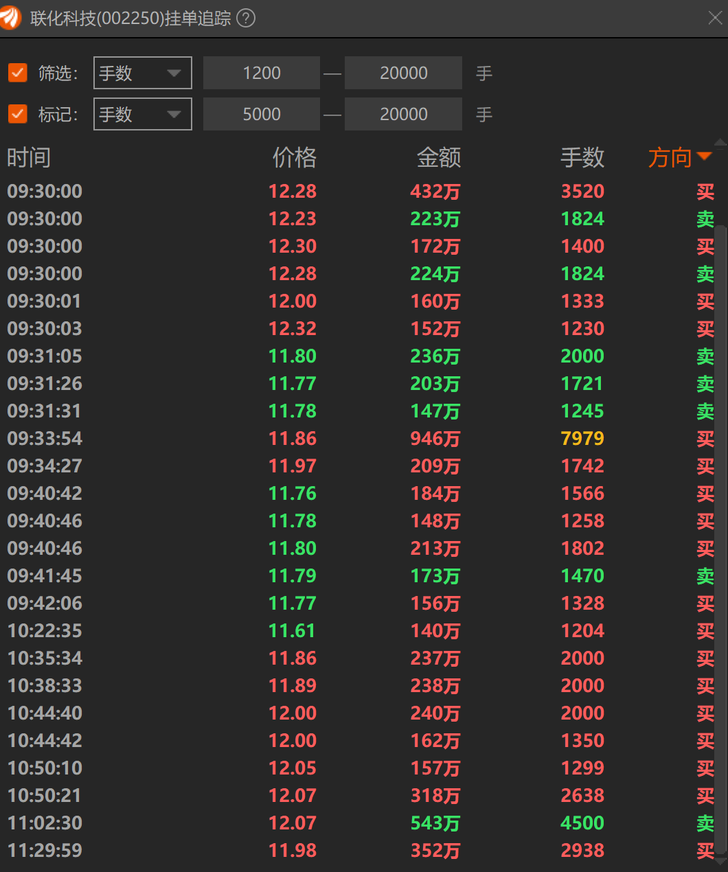 下图是截至上午收盘的大单追踪(大于等于1200手),其实1000手的大单也很多,只是由于屏幕显示所限,不方便截图。11点02分4500手的大卖单报价是12.07,明显就是猪力压单的操作。