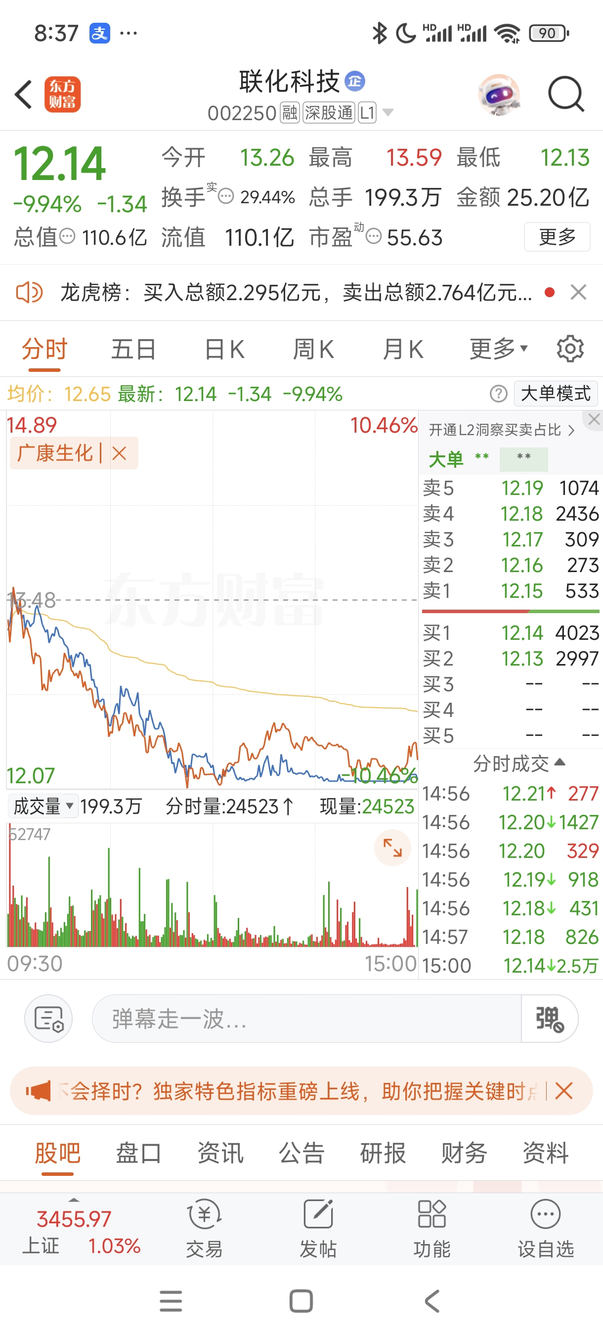 4.联化科技和广康今天做了分离,广康在多多的喊单下,在zyd的反攻下率先拉红,昨天这俩兄弟可是形影不离,广康减持和联化的量化转移共同带崩了联化,跌停得莫名其妙,今天广康率先分离翻红,明天联化有望企稳回升