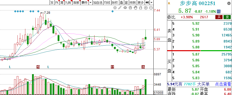 新零售板块今天有7只涨停,步步高是冲高回落,但也显示出市场对于零售板块的青睐,6连板的东百集团彰显了风口的威力,下周步步高大有在零售的助攻下做补涨的机遇。公司现经营门店共55家,其中超市23家,百货、购物中心占32家。 学习胖东来经营模式,中央厨房在胖东来的帮助下进行了调改,也学习胖东来建立蔬菜水果的种植基地。三季报开始大增扭亏为盈,转型后的效果突出。技术上,昨天的涨停算是止跌形态,今天的拉高算是突破模式,但冲高回落就显示遇到前方筹码的伏击,周一除非是直接反包住今天的射击线,否则极有可能是走震荡上行结构,今天还没去,等进一步的形态修复。