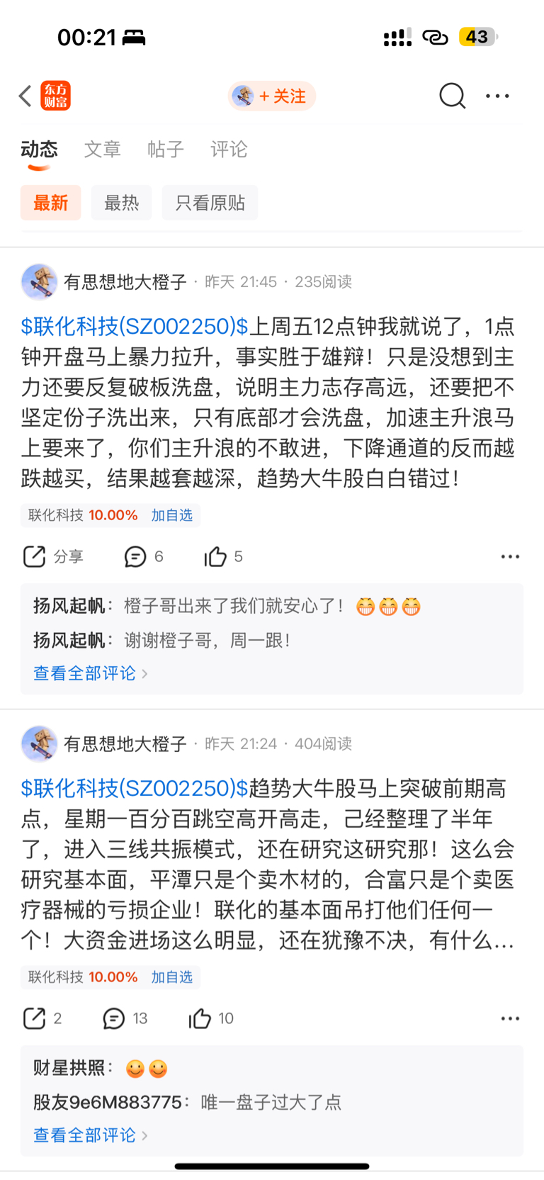 $联化科技(SZ002250)$ 看到这种号来了周一必完蛋,他帖子下面的全是自己的小号回复。吓人