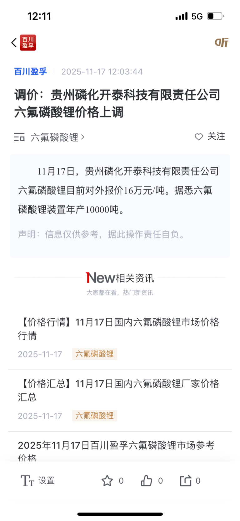 $联化科技(SZ002250)$ $永太科技(SZ002326)$ $平潭发展(SZ000592)$ 六氟磷酸锂继续涨,类似存储涨价周期都是按月为单位,继续干