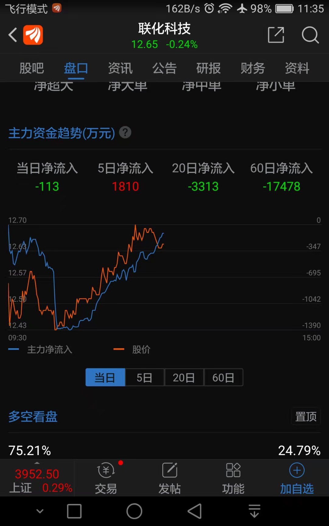 中午收盘为止,剪刀差已经形成,主力继续加仓中,韭菜不跟,是韭菜的损失。早盘下杀时,主力净流出超过500万,上午收盘止,已经缩小净流出到113万,主力在做左手倒右手的动作,洗盘振仓,为反弹做准备。