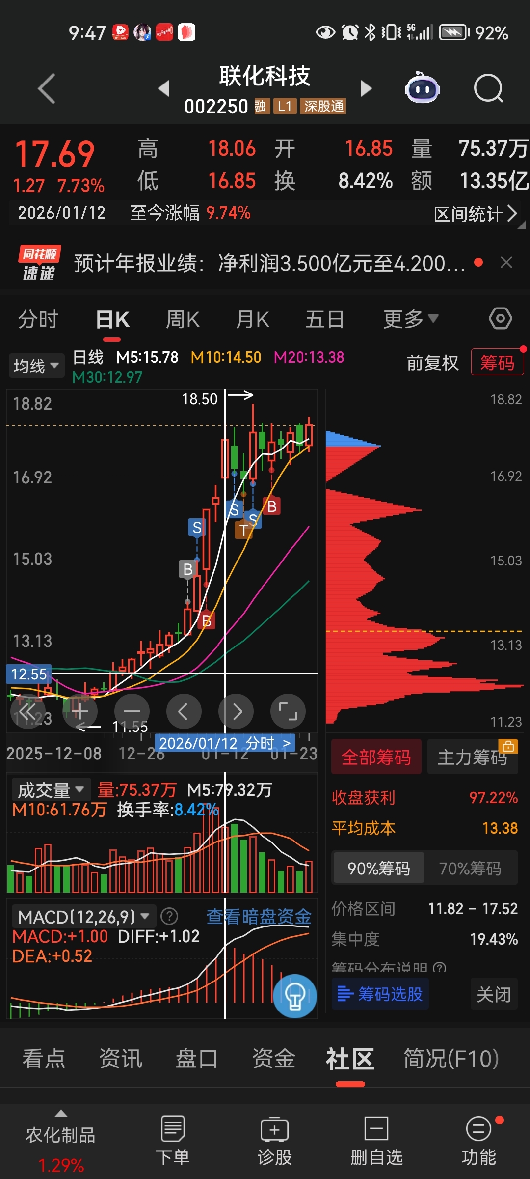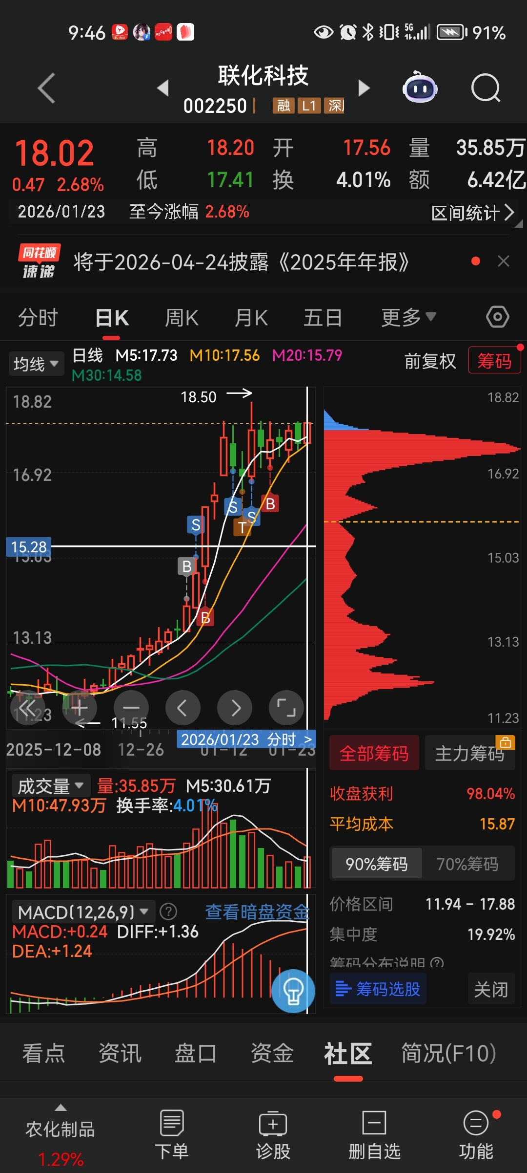 整个技术面呈现多头趋势不变,目前仍然处于震荡偏上走势(今天的收盘价18.02,又创近期收盘价新高)。