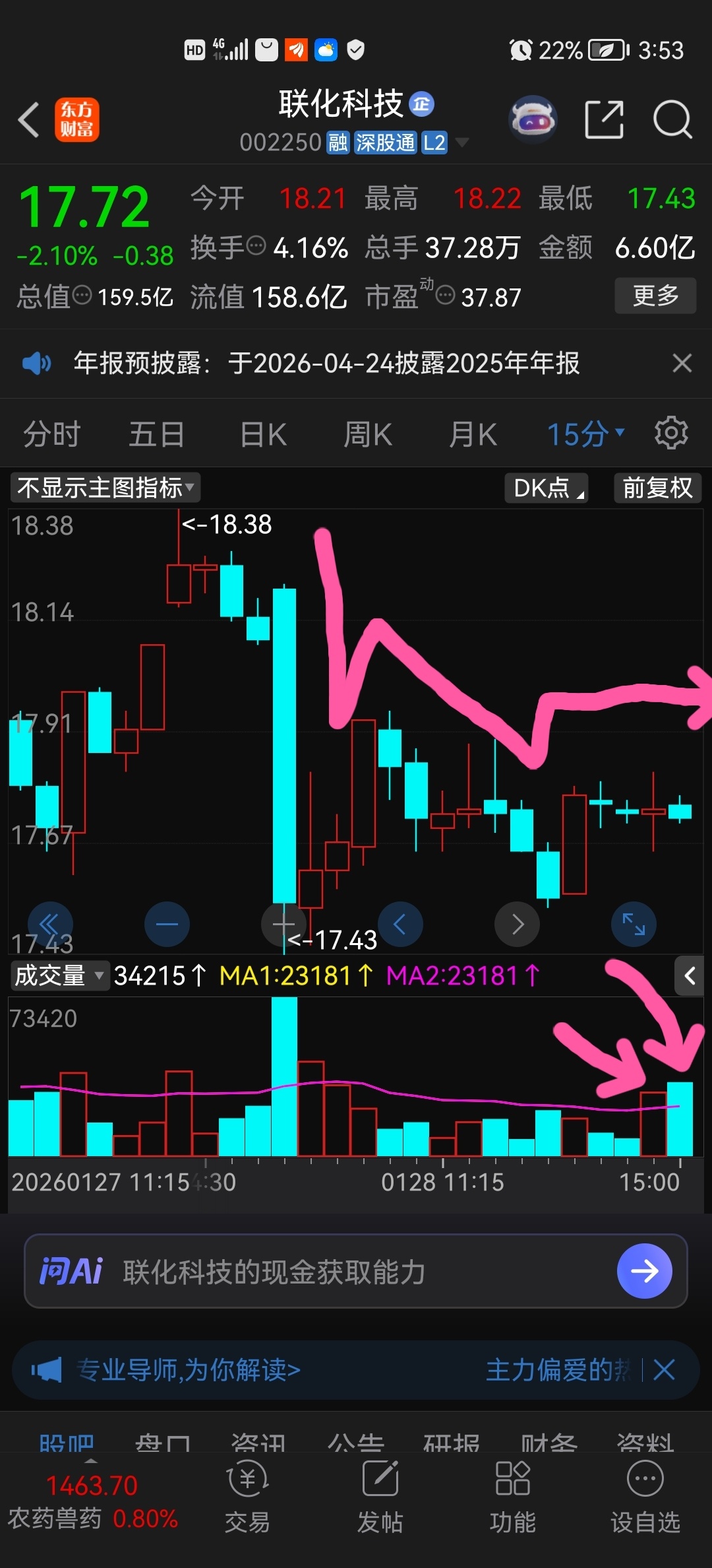 小分时里巨阴破位,盘中修复,再回落释放抛压,再横盘整理。尤其最后两个小分时分别,先冲高放量滞涨,之后放量承压抗跌。