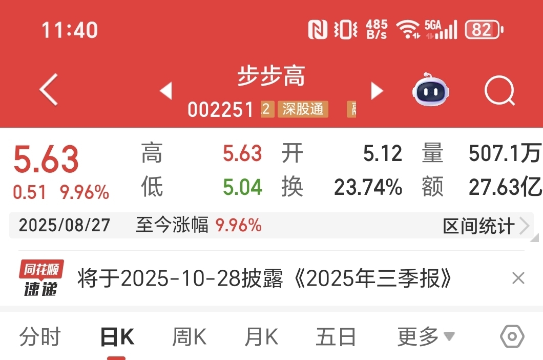 现在一直卡在5.63吸货有说法的,8月27日涨停板价格就是5.63