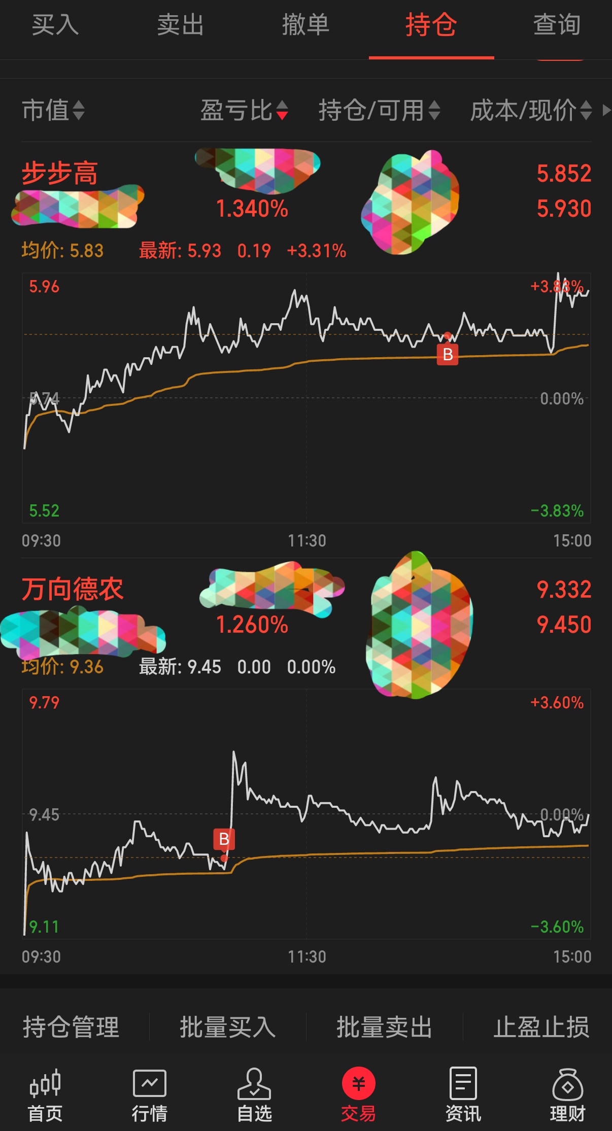 #炒股日记# $步步高(SZ002251)$ $万向德农(SH600371)$ 今天分别在均线附近低吸两个股各10万,收盘分别盈利1个多点,期待明日吃肉。坚持模式,对错无悔