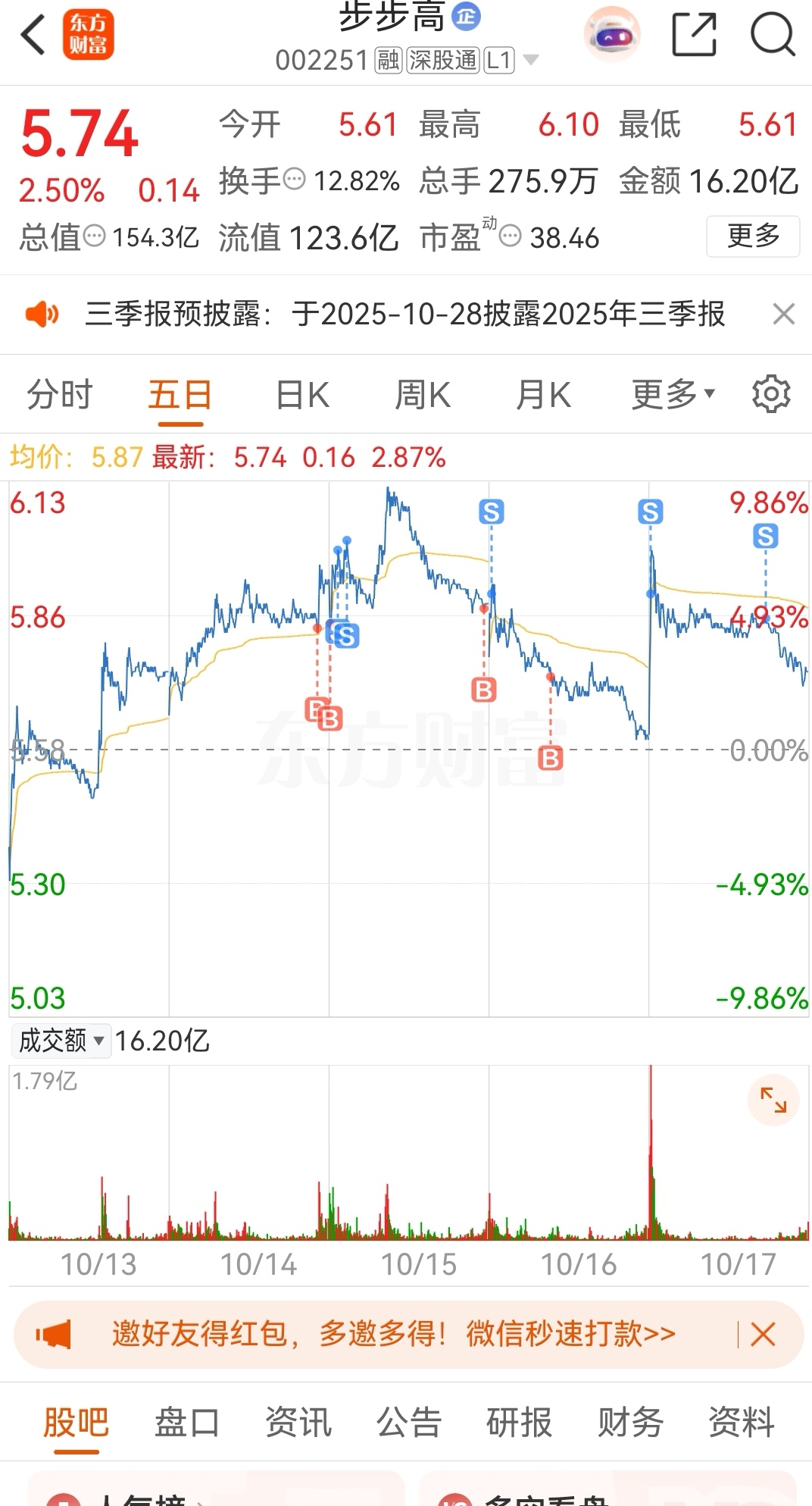 $步步高(SZ002251)$ 持仓四天,挣了八个点,今天清仓,下周再接回来