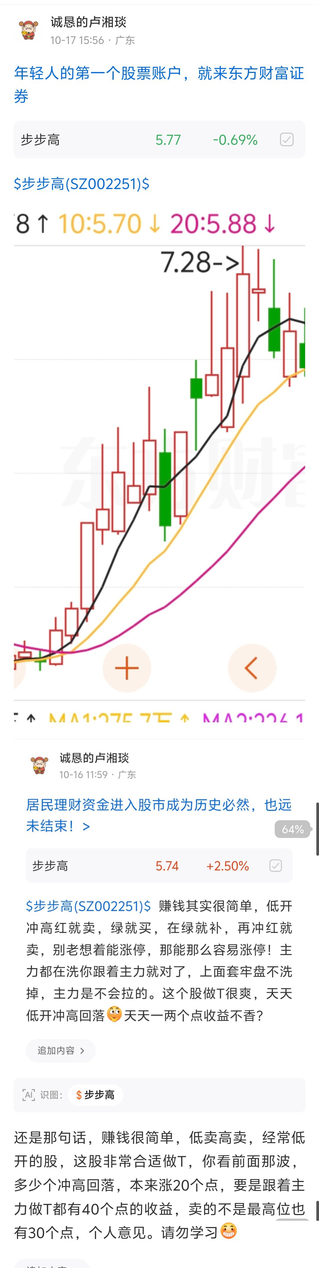 $步步高(SZ002251)$ 最近跟T,T了差不多一个涨停,别想着T飞,这股尿性天天低开冲高回落,只要把握好开盘20分钟,只要有一两个点直接卖,绿了就接回来之前就有说过