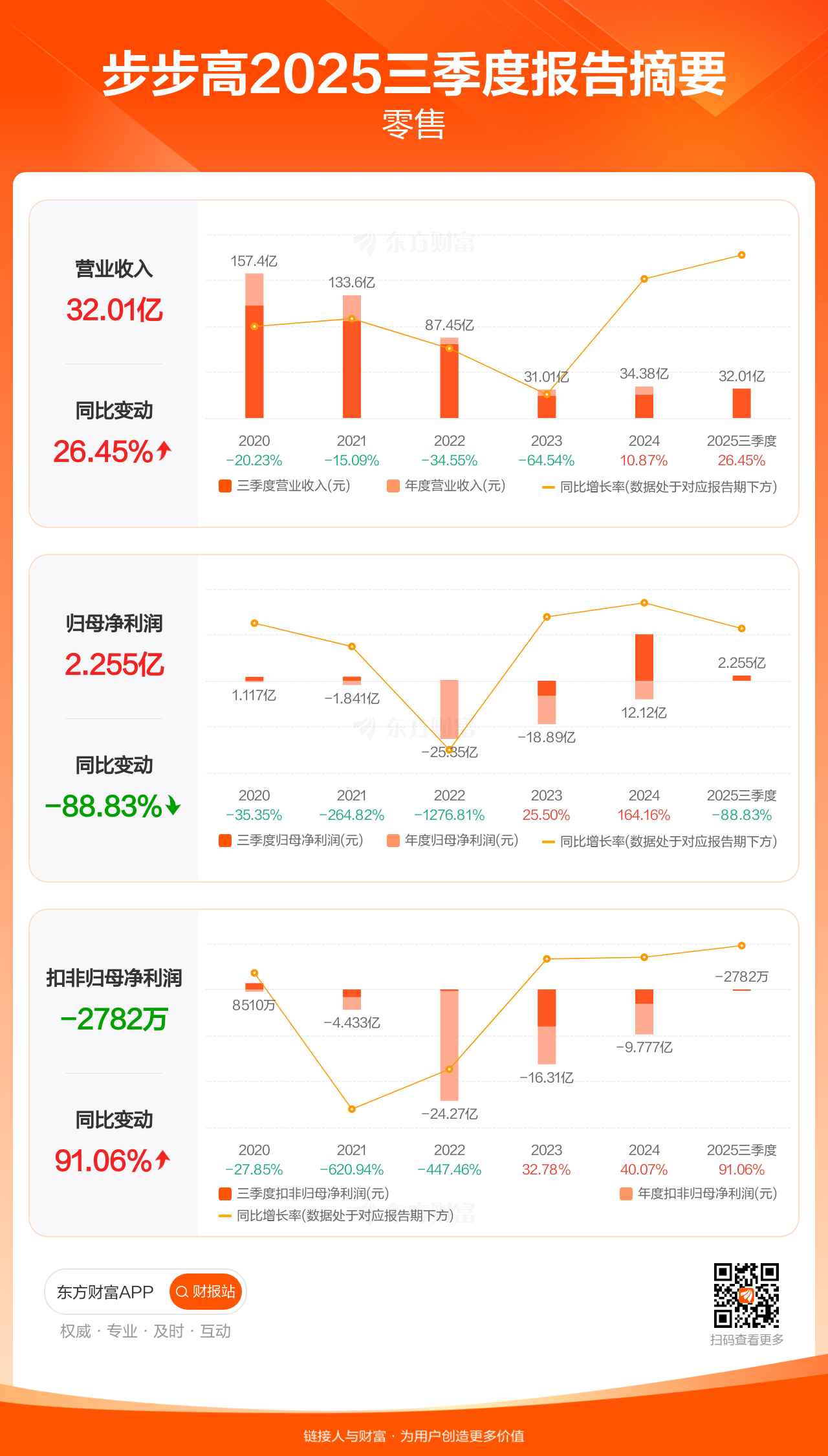 步步高10月28日发布2025年三季报显示,公司前三季实现营业收入32.01亿元,同比增长26.45%;归母净利润2.26亿元,同比下滑88.83%;扣非归母净利润-2781.92万元。