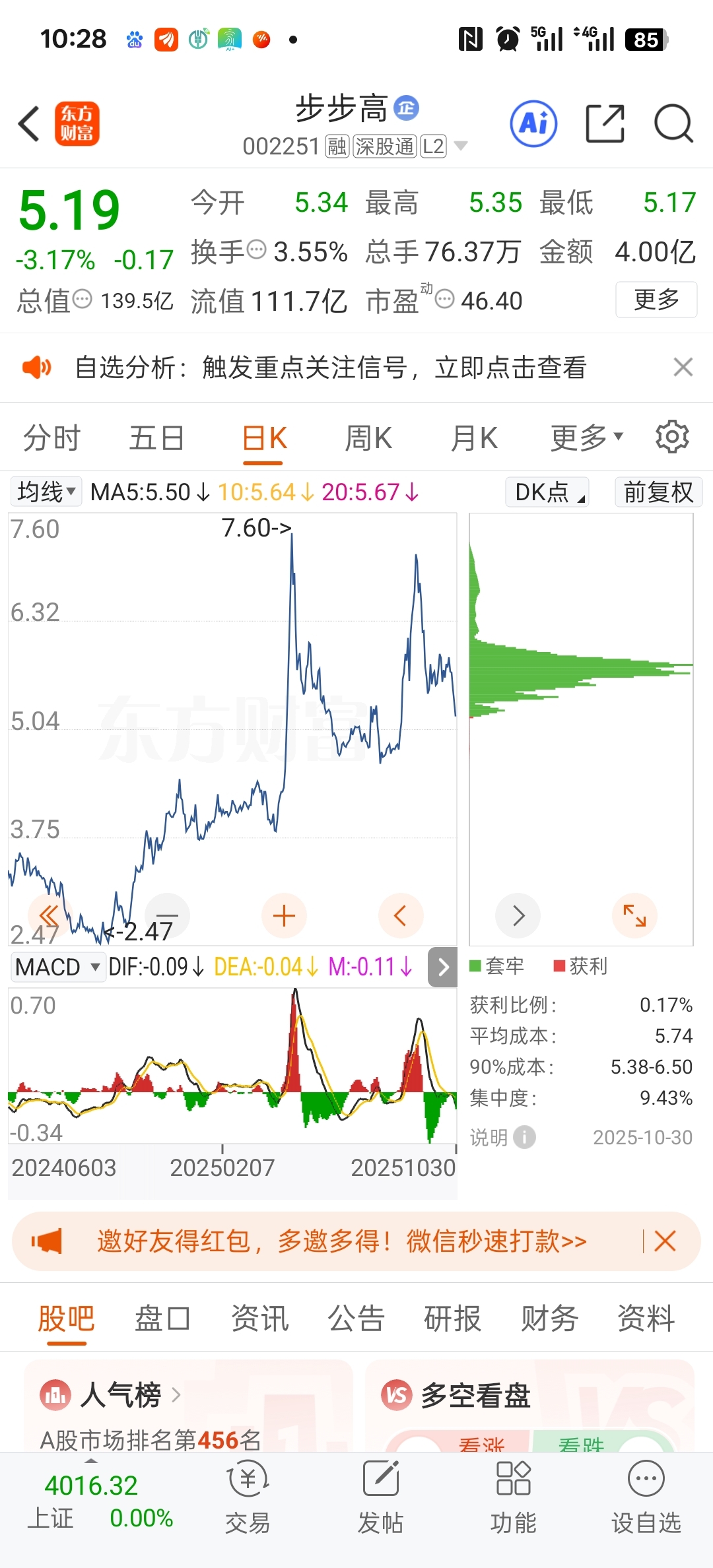 $步步高(SZ002251)$ 这个真看不懂。怎么可能获利盘只有0.17。它是从2块多拉起来的啊。