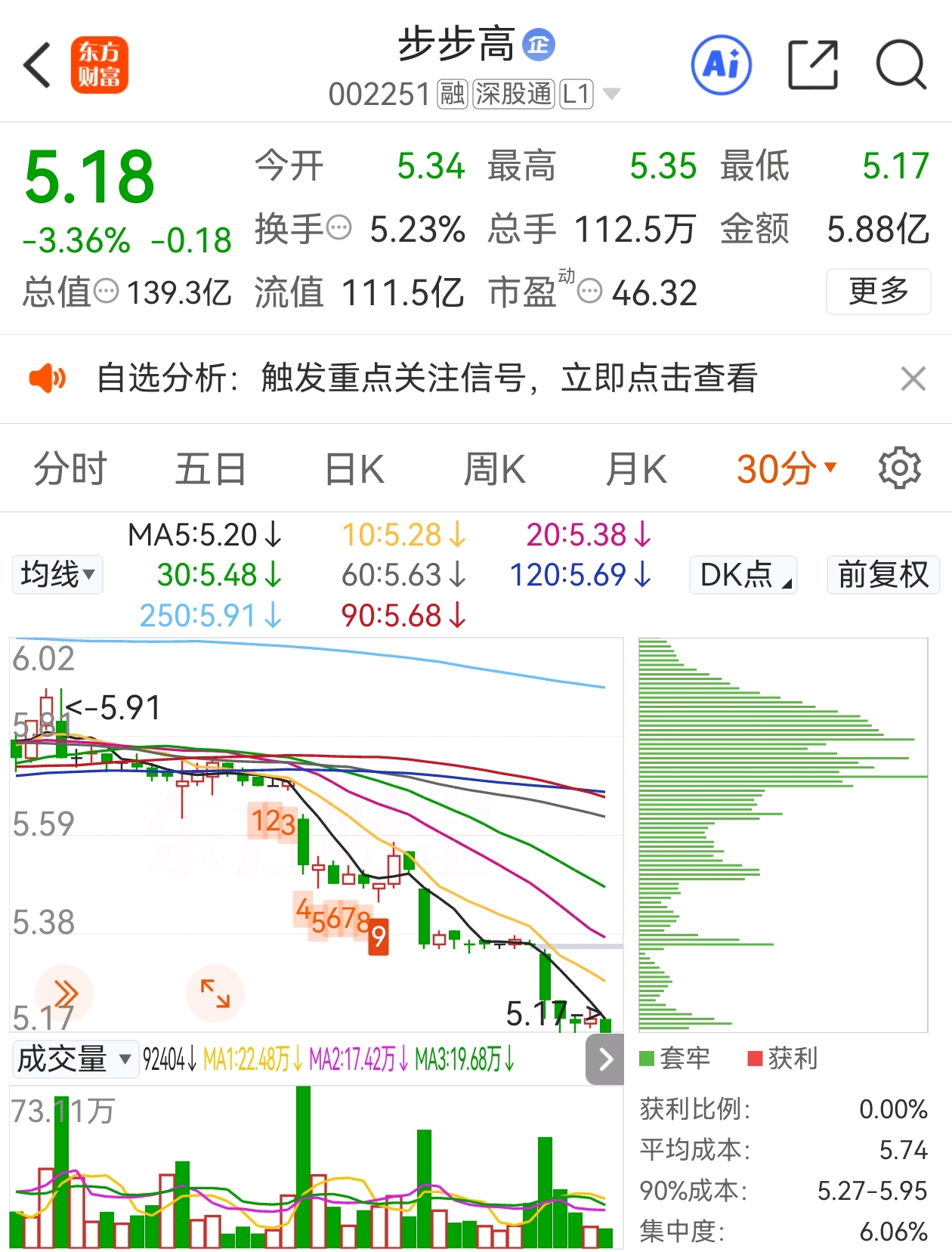 $步步高(SZ002251)$ 30分钟级别开盘连续3个跳空缺口,下杀取量,量却放不出来,只能无量阴跌了,向下看到4.7-4.8寻找企稳迹象再进。