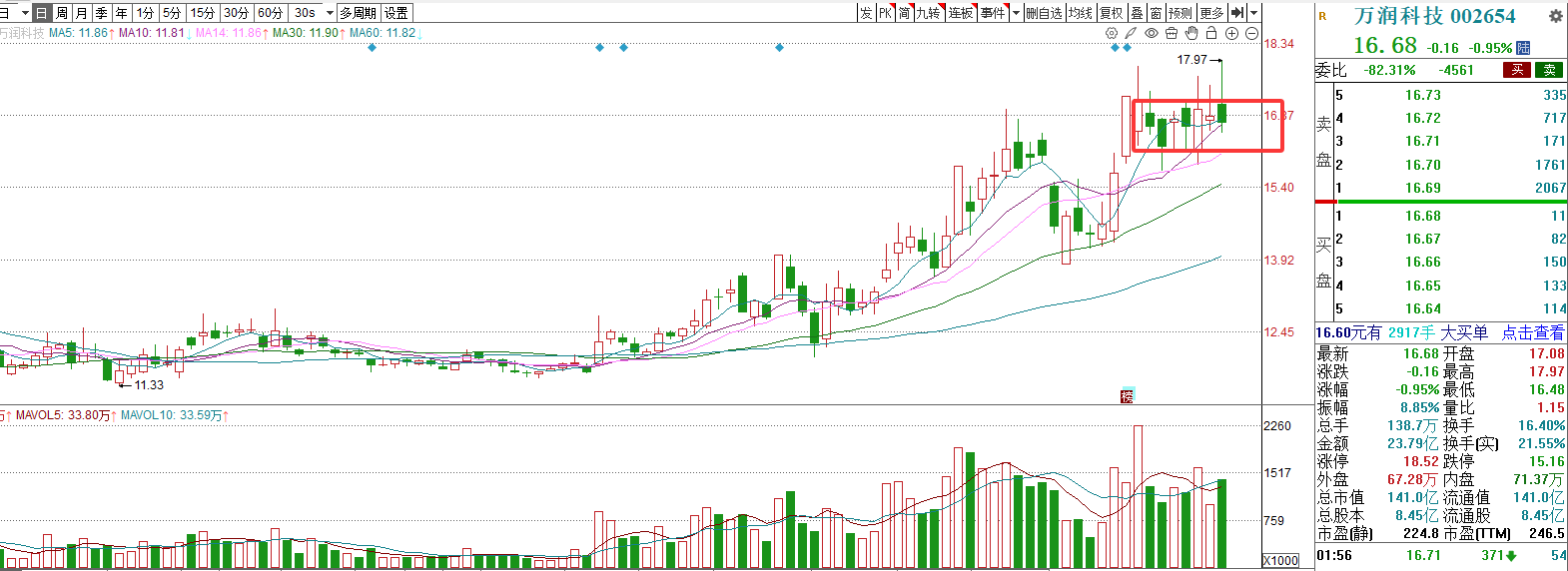 公司主营LED光源器件和LED照明产品两大块,属于国家级高新技术企业。它是长江产业投资集团旗下,背靠长江储存。目前正处于转型关键时刻,旗下子公司万润半导体主要从事储存芯片,芯片国产替代已经是大势所趋,一旦转型成功市场空间巨大,这是它最大的亮点。融入题材主要是储存芯片,人工智能,机器人等,受国际储存芯片价格大涨影响,近期这个题材也是明显活跃。技术上,最近横盘震荡明显是放量拉升缩量震荡,这些整理调整特征。昨天尽管冲高回落,但大单依然是净流入的。目前已经到了短线分水岭,今天若能保持强势就是向上突破。早盘集合竞价若能继续高开,上涨就更加明朗。策略是水上走强研究,水下震荡继续观望。