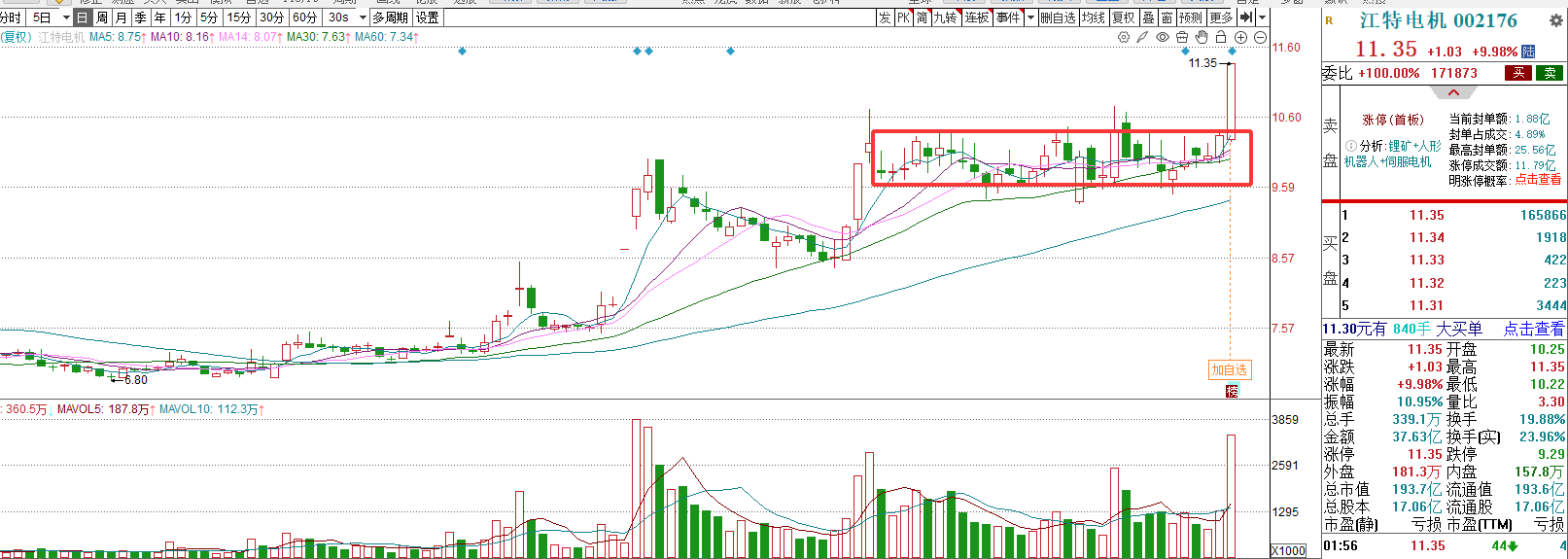 公司主营是锂云母采选以及碳酸锂价格,特种电机研发和生产。公司最大的亮点是拥有最丰富的锂云母矿产资源,拥有的锂矿资源巨大,并具备了从开采到提炼一体化另产能。外风电配套电机,建机电机等都是国内最大基地。最近受碳酸锂价格不断上行的好消息,相关概念股一直都是明显强于市场。题材非常丰富,主要融入题材是锂电,固态电池以及人型机器人,都是市场主线之一。再看技术上,均线多头向上趋势非常明显,8月份以来就走出了双重的大底部。昨日长阳突破了最近横盘震荡区,已经上升新一个台阶。龙虎显示,北向和一线著名柚子大幅流入,将大大提振短期股价上涨。早盘集合竞价还会是水上开,若幅度不大开盘就可以重点研究。