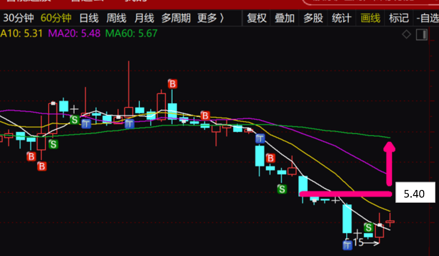 目前还是看弱势调整,连30分钟 20日均线都还没摸,可以说反弹的强度都太弱,至少要站上5.40才考虑方向调整。