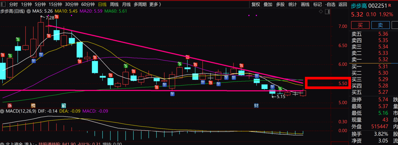 先看今天收盘是否能站上5.30(之前说的强压力位置),从K线来看仍然是弱势,下降
