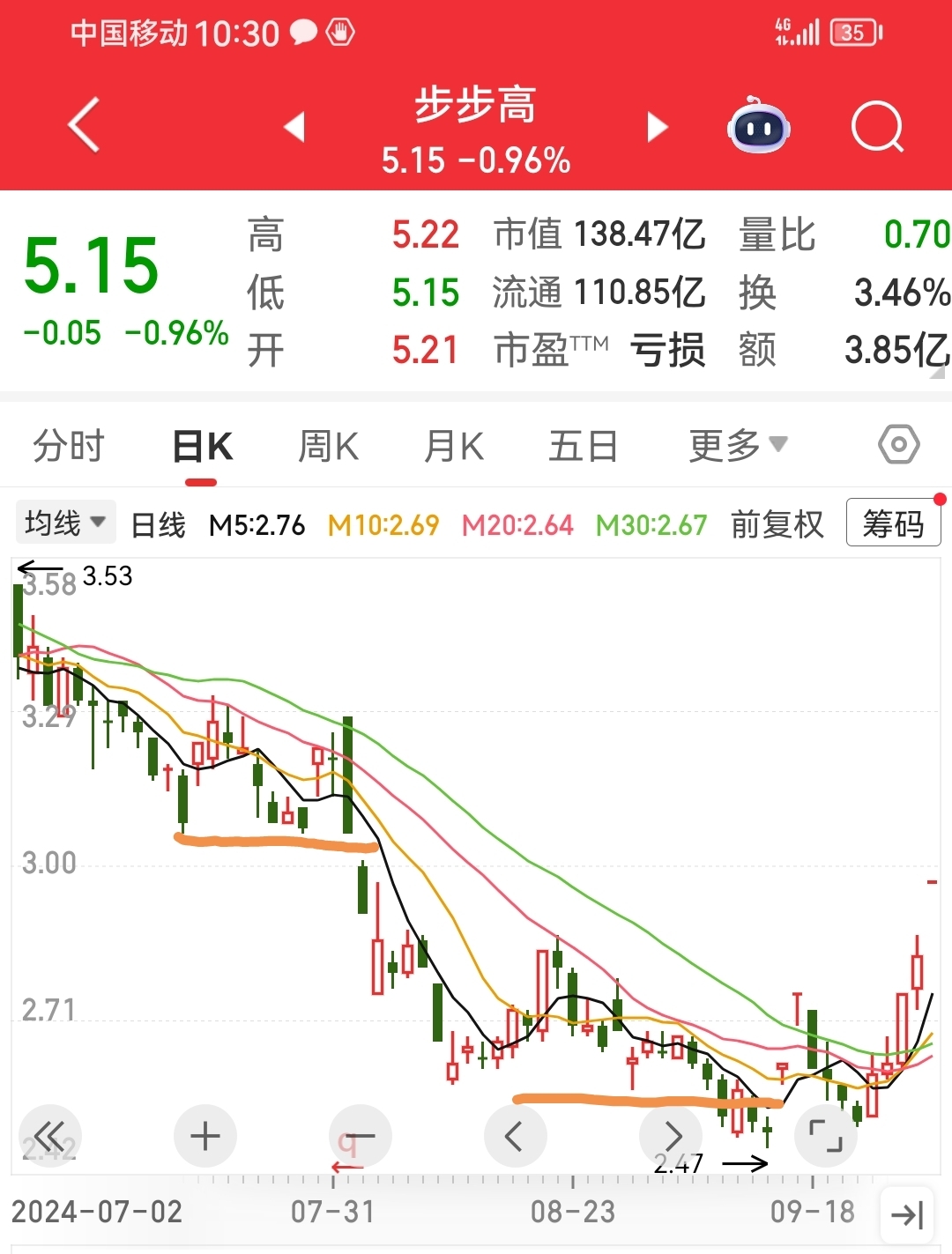 $步步高(SZ002251)$ 上周五卖出止损,原因跌破位,虽然是地量,但是打到最低价格5.15收盘,向下杀的风险还是大于机会,所以止损,下周还有机会上车!参考我画区间,不是我不看好步步高,是庄筹码没吃够!