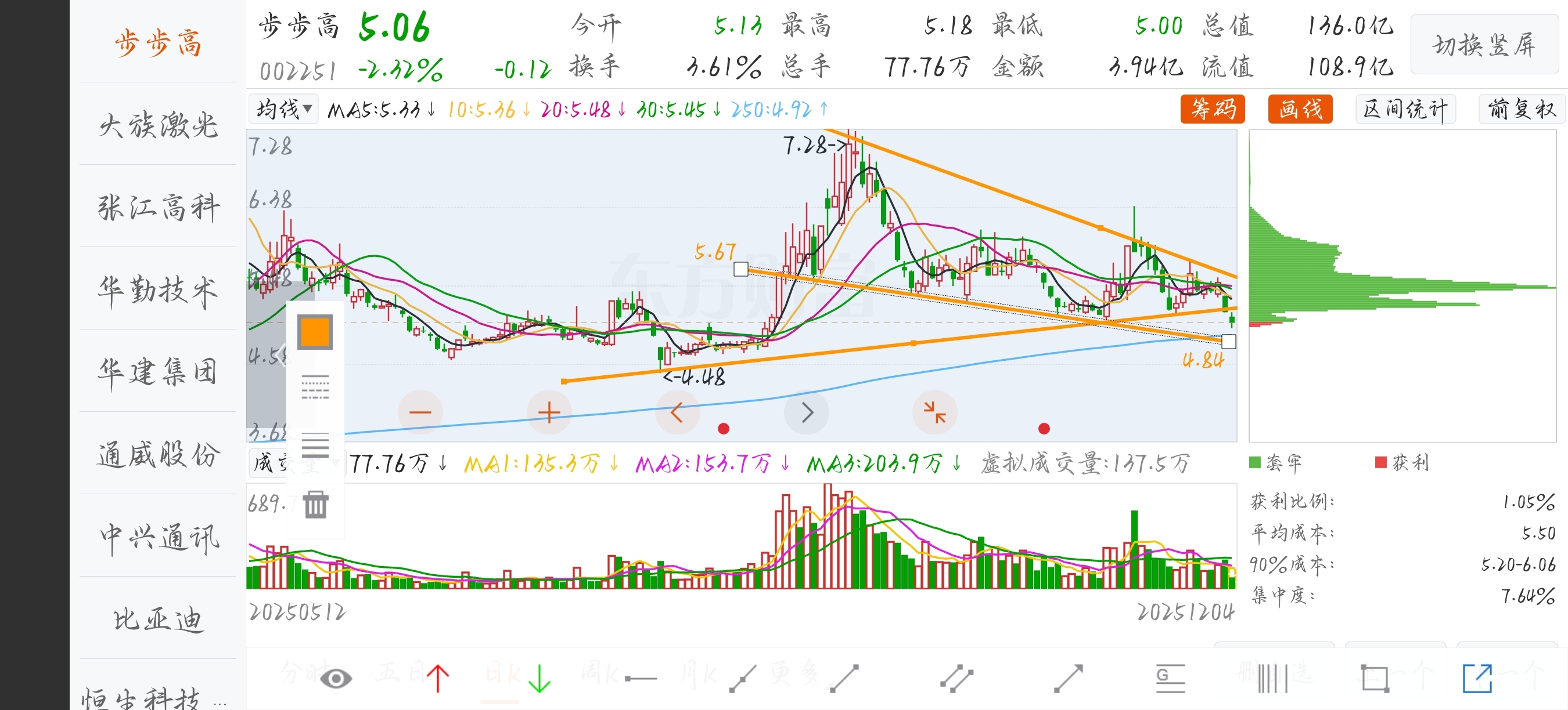 $步步高(SZ002251)$ 兄弟们,我刚才又找到一根线,放心,下面有支撑,最多再跌五六个点,目前我三分之一仓参与,今天做了个几分钱的t感觉没什么意思,之后就懒得t了,破五元半仓,到4.8三分之二仓,最后的仓位留到上涨趋势确定了加上