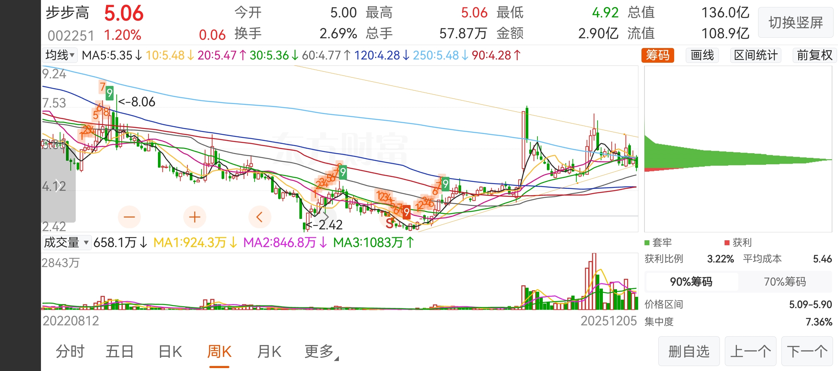 $步步高(SZ002251)$ 看懂这个图,不犟种,还能帮你少亏至少10个点,周线级别跌破上升趋势线,和日线同理构成周线级别的楔形下跌中继,当前筹码峰全部是套牢盘,操盘手只有向下砸出空间,重新吸筹洗盘才有利润空间,也就是说要在当前筹码峰的下方重新形成顶格筹码峰才有可能转为向上,结构上目标价位测算至4.55元,周期还有6个星期。#复盘记录#