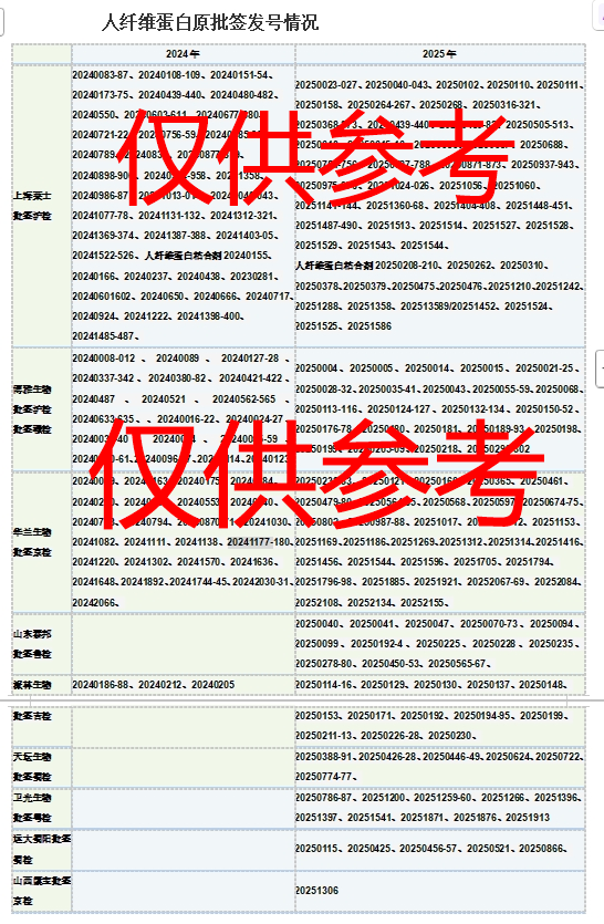 此外,根据血制品上市公司2024年年报、2025年半年报和公司公告整理,有4家血制品公司控股子公司均在研发人纤维蛋白原:2025年10月1日天坛生物发布公告,公司下属企业国药集团昆明血液制品有限公司获得国家药品监督管理局签发的《药物临床试验批准通知书》,同意开展“人纤维蛋白原”临床试验;华兰生物2024年年度报告载明公司子公司华兰生物工程重庆有限公司已开展人纤维蛋白原临床前研究;上海莱士2025年2月13日公告郑州莱士血液制品有限公司收到国药监局下发的关于“人纤维蛋白原”药物临床试验批准通知书;2023年4月29日派林生物发布了《关于子公司收到人纤维蛋白原临床试验数据核查与注册现场核查通知的公告》,广东双林生物制药有限公司收到国家药品监督管理局药品审评中心的《药审中心关于启动人纤维蛋白原临床试验数据核查的通知》和《药审中心关于启动人纤维蛋白原注册现场核查的通知》,药审中心根据《药品注册管理办法》有关规定,对广东双林申报注册的人纤维蛋白原(受理号:CXSS2300008)启动药品注册核查(临床)和药品注册核查(药学)(这么久了为何没有下文,公司财报中一字未提)。