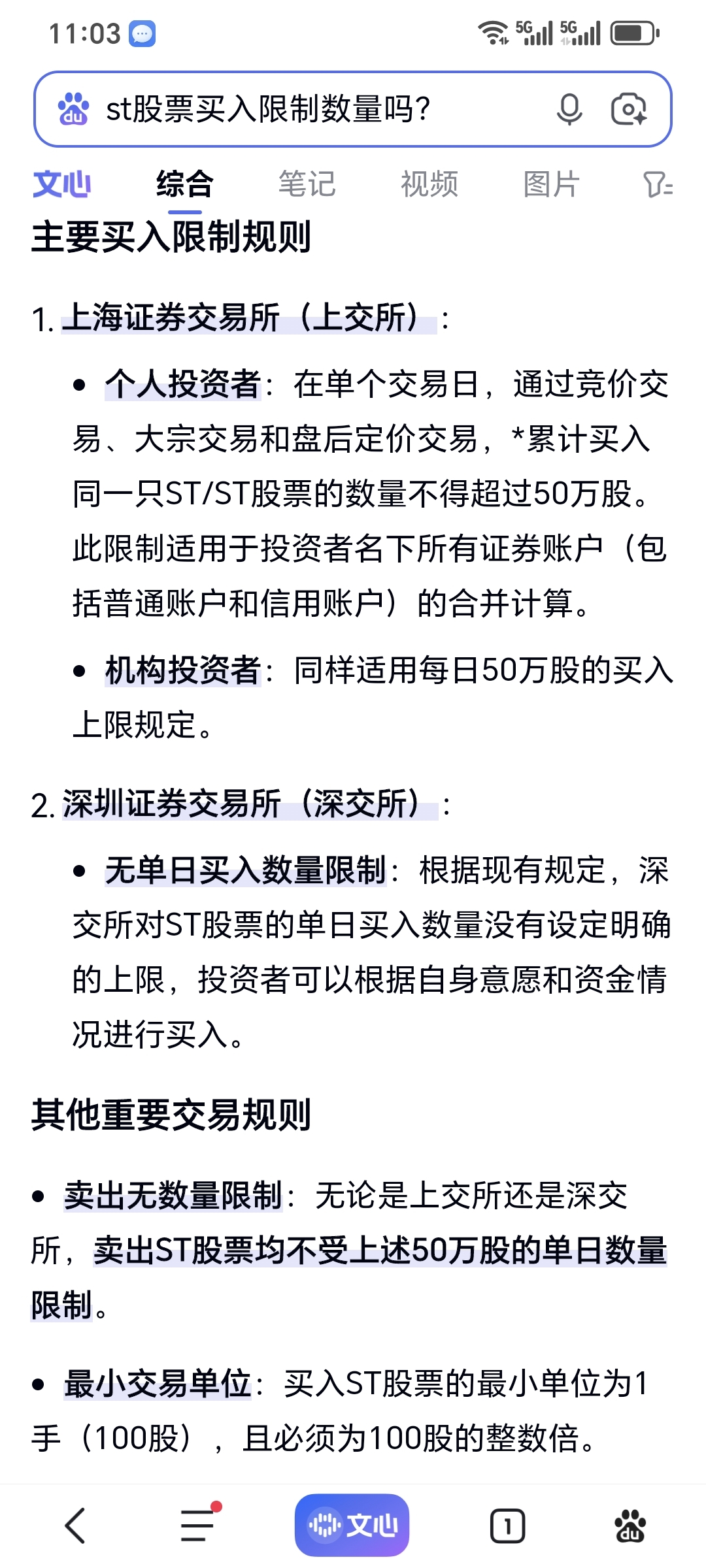 $*ST智胜(SZ002253)$ 请教大家一个问题:我看了一下ST股票沪市无论是机构还是个人都有累计不能超过50万股的限制,深市ST股没有累计限制,但也有当日买入不能超过50万股的限制,那么如果庄家要操作这个股是不是要几百个账户才能控制股价啊?我的意思是如果有这个限制应该不会有机构,基金,游资买这种股票吧?没有庄的股那就不可能成为牛股。有哪位大神知道?