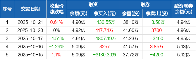 泰和新材融资融券信息显示,2025年10月21日融资净偿还130.55万元;融资余额4.9亿元,较前一日下降0.27%。