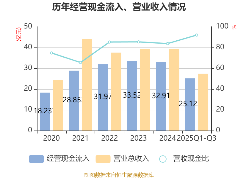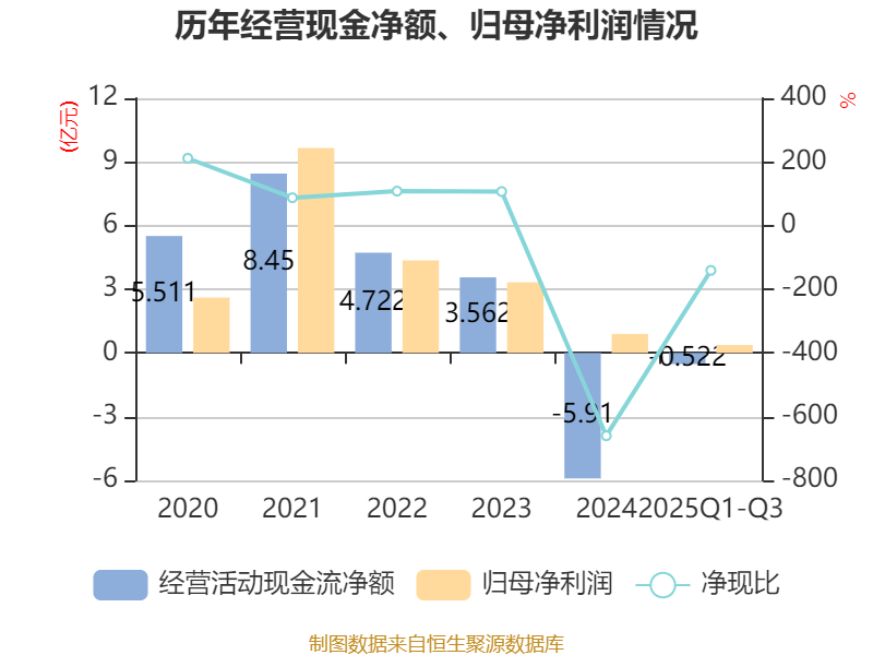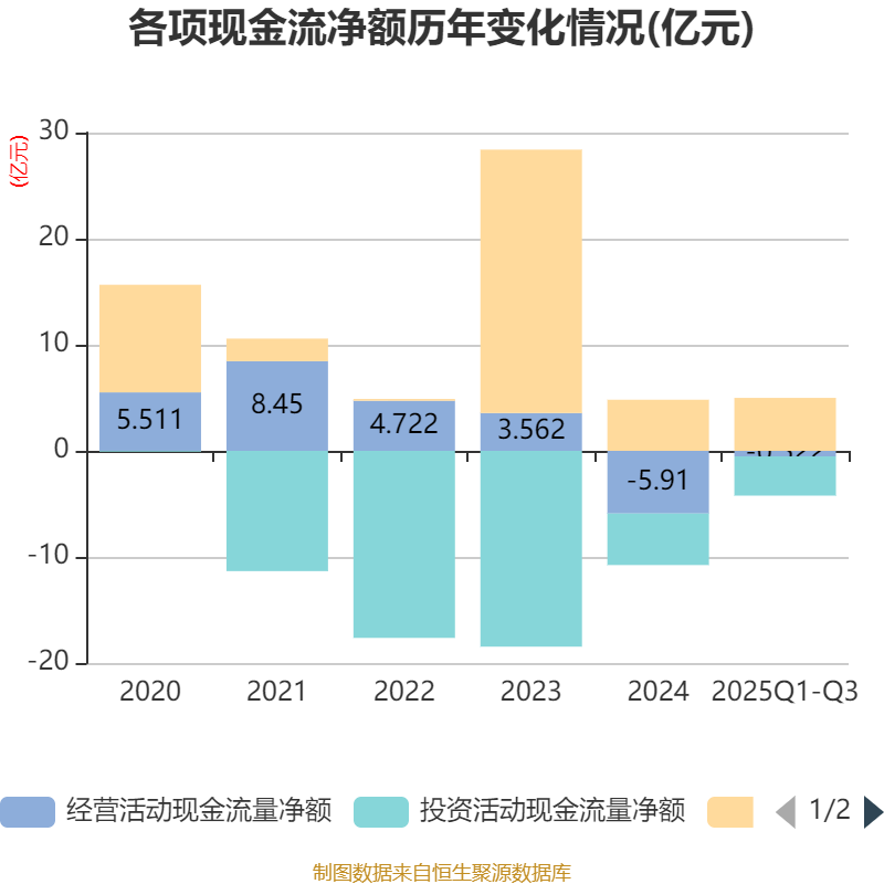 2025年前三季度,公司经营活动现金流净额为-5215.47万元,同比减少8381.3万元;筹资活动现金流净额4.99亿元,同比增加2.01亿元;投资活动现金流净额-3.7亿元,上年同期为-8.78亿元。