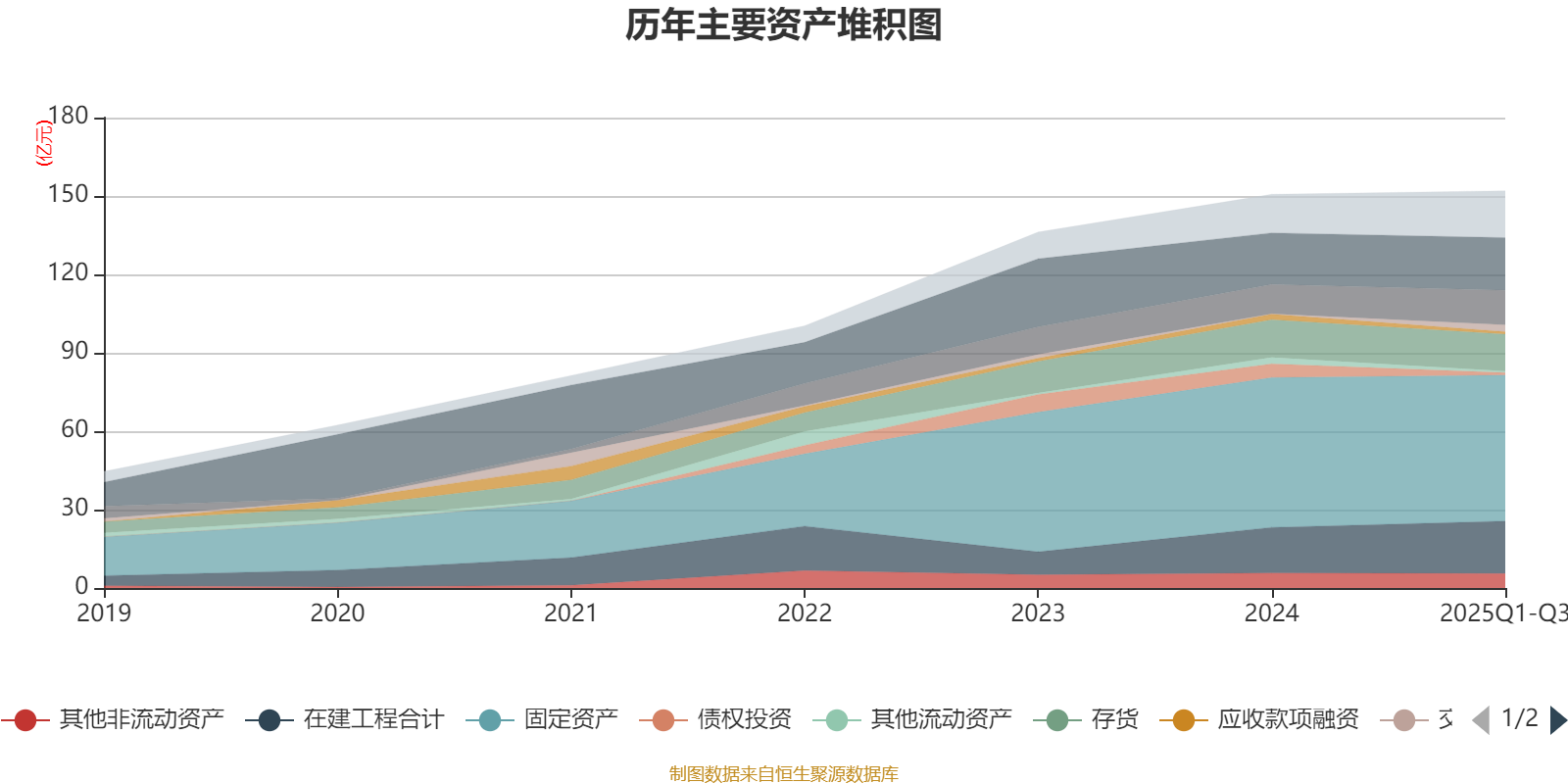 资产重大变化方面,截至2025年三季度末,公司债权投资较上年末减少82.22%,占公司总资产比重下降2.88个百分点;一年内到期的非流动资产较上年末增加184.51%,占公司总资产比重上升2.11个百分点;交易性金融资产合计较上年末增加1634.06%,占公司总资产比重上升1.61个百分点;在建工程合计较上年末增加14.93%,占公司总资产比重上升1.61个百分点。