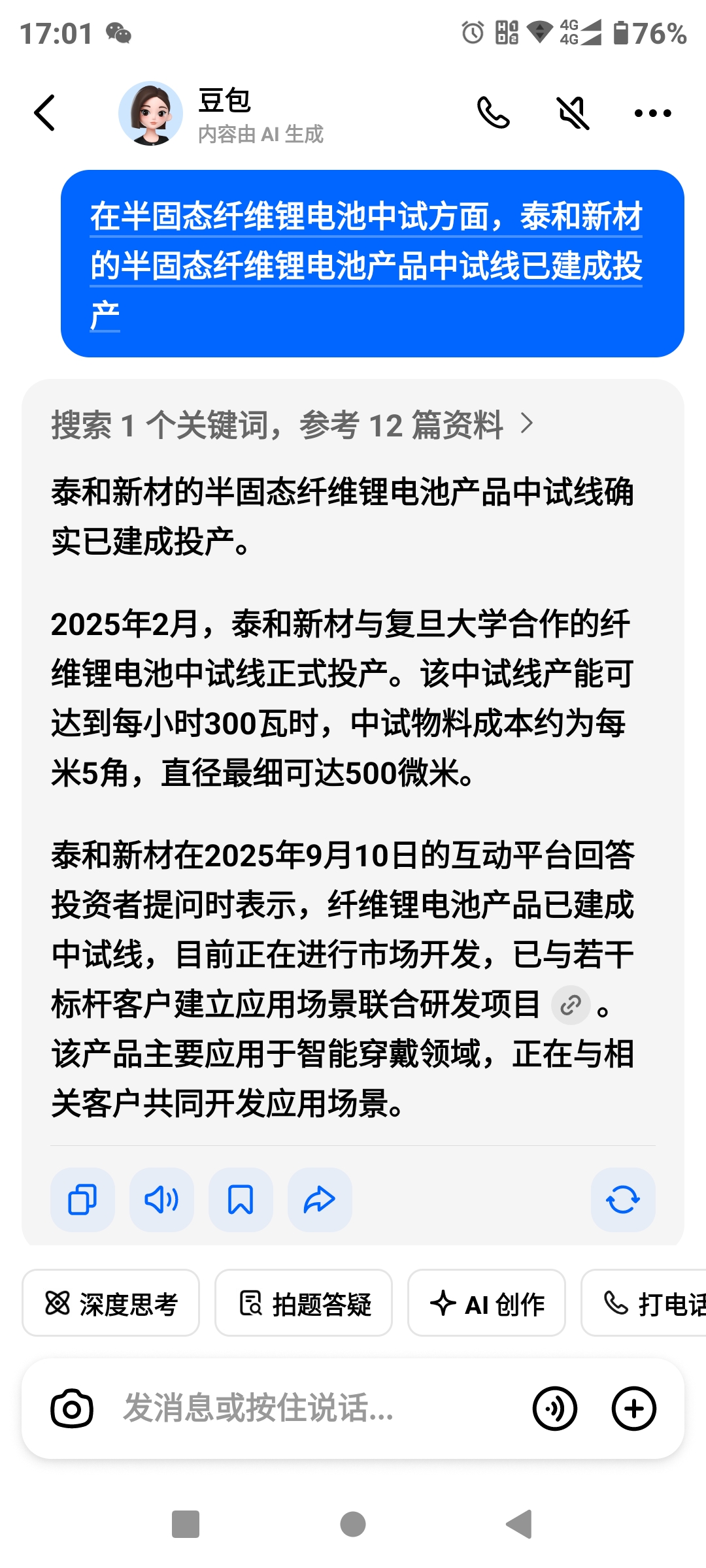 在半固态纤维锂电池中试方面,泰和新材的半固态纤维锂电池产品中试线已建成投产。