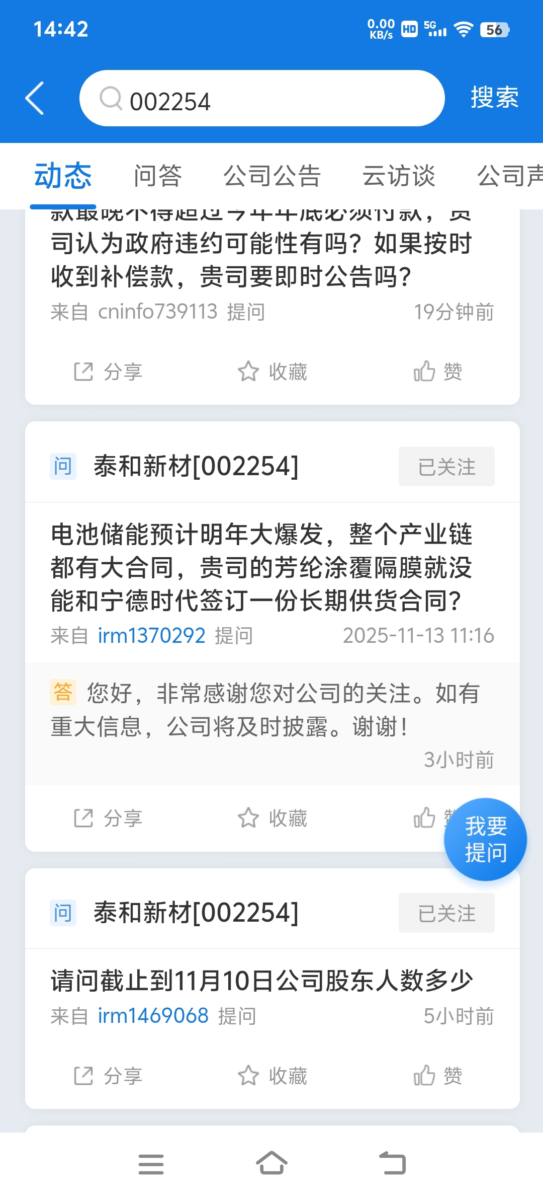 $泰和新材(SZ002254)$ 大家看下董秘绝对有鬼,配合庄家做盘,有人5小时前问了11月10日的股东人数不回复,3小时前问的问却回复了,前面问的不回却回复后面问题。难怪前段时间有人评论我的帖子说,以他十几年的炒股经验很可能是公司请人操盘的,所以大家别去关注董秘的回复,根本没任何意义,都是配合庄家做盘,我现在很怀疑董秘回复的股东人数是否是真的。