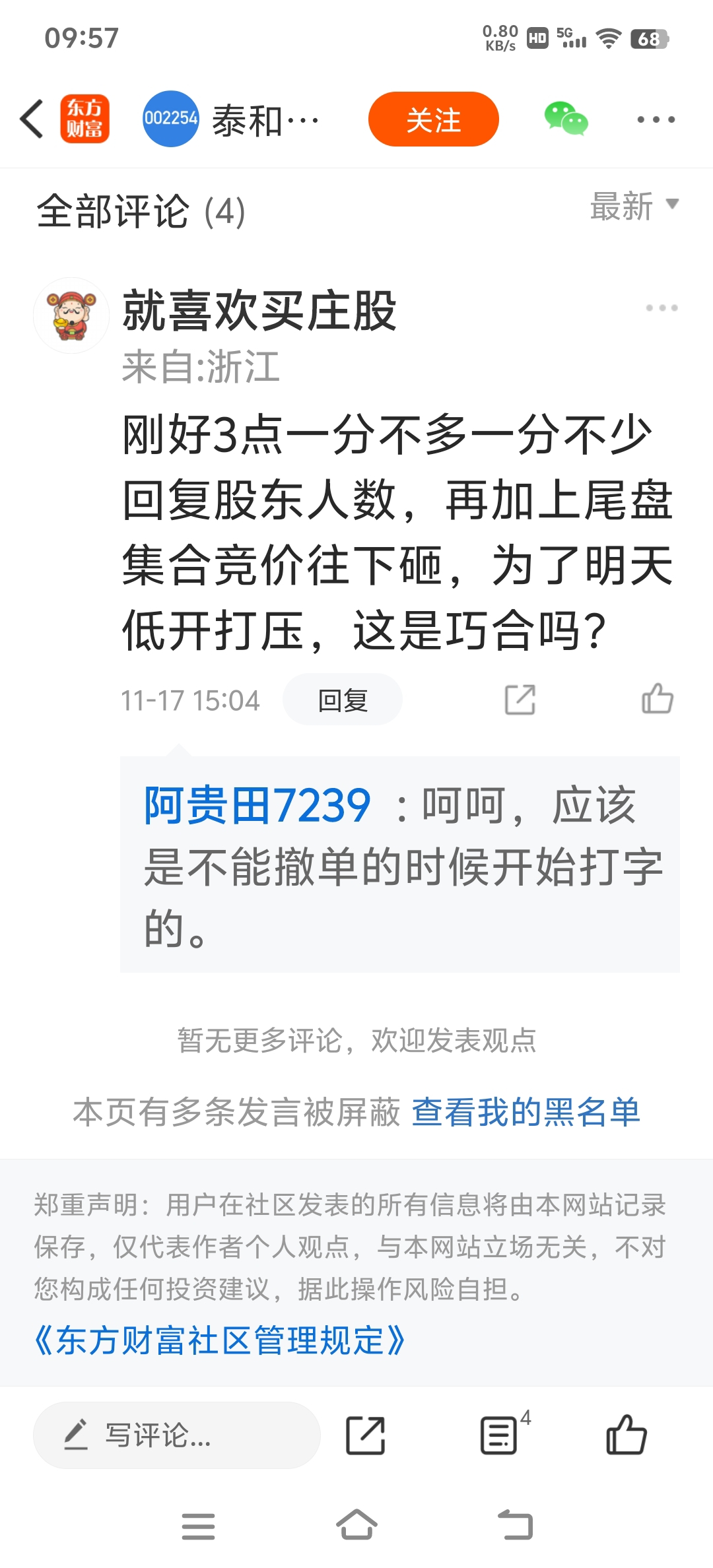 $泰和新材(SZ002254)$ 昨天收盘我就说了,从董秘回复股东人数的时间刚好是3点整一分不多一分不少,加上尾盘集合竞价尾盘砸下来,就知道今天庄家又要对倒砸盘打压了,昨天有位老哥就在我贴子下面评论,泰和其他资金不敢抄底是因为公司与庄家的密切配合看来确实如此,这样密切配合才使庄家可以随心所欲涨跌了,我现在有点怀疑股东人数的真实性。