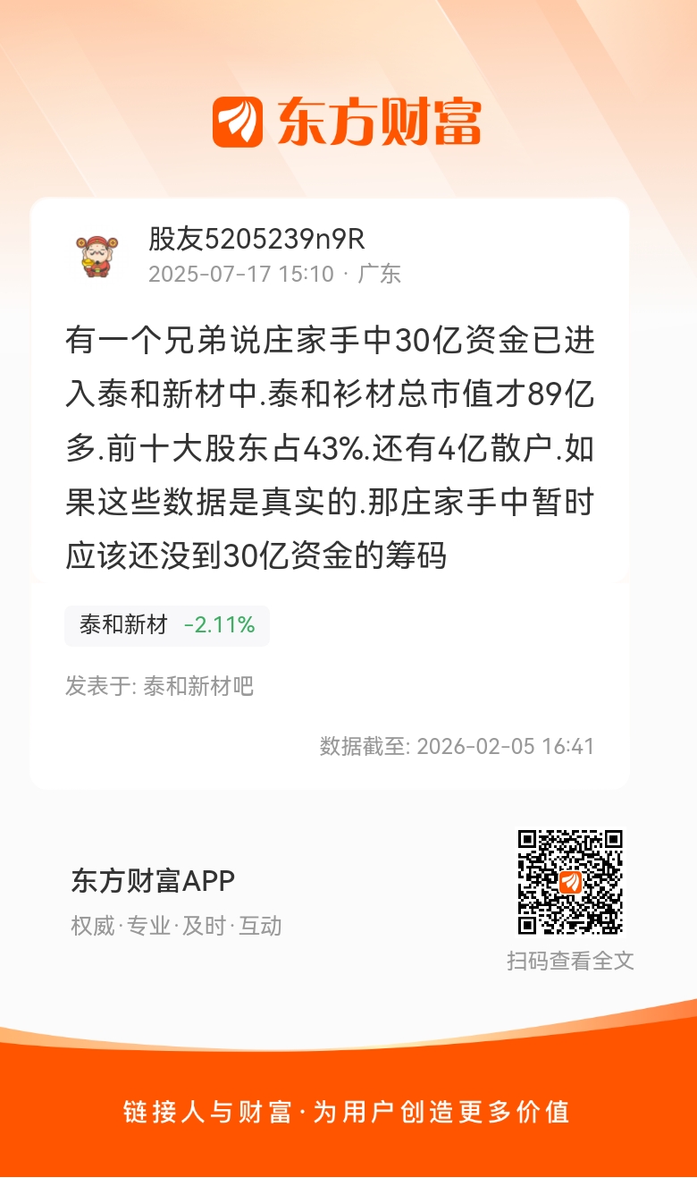 有一个兄弟说庄家手中30亿资金已进入泰和新材中.泰和衫材总市值才89亿多.前十大股东占43%.还有4亿散户.如果这些数据是真实的.那庄家手中暂时应该还没到30亿资金的筹码
