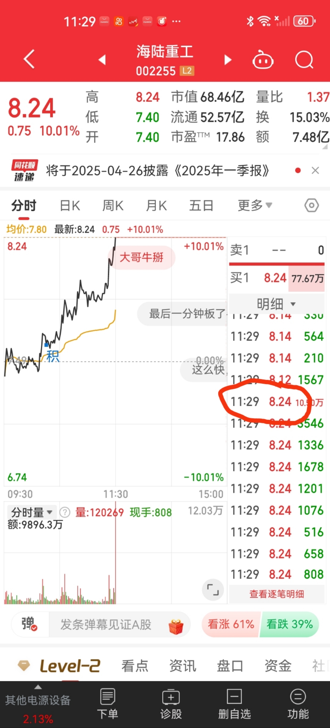 $海陆重工(SZ002255)$ 守得云开见月明,舱门已关。一笔超10万手的买单直接把股价从8.12元拉至涨停,让不少打板客踏空,也标志着底部洗盘结束。
