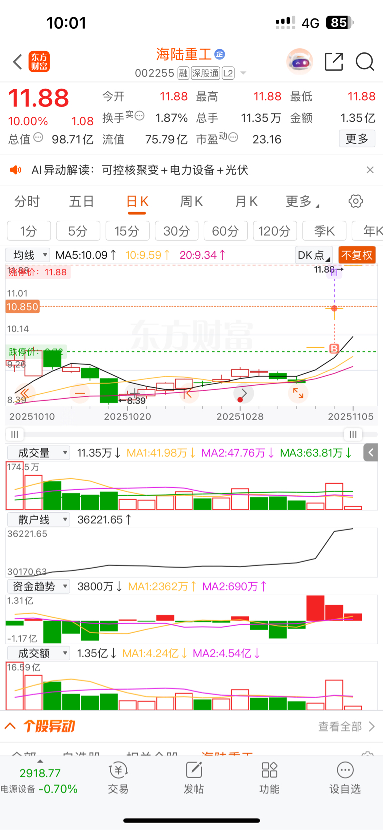 $海陆重工(SZ002255)$ 昨天就花了一千块试一试,今天赚了100块