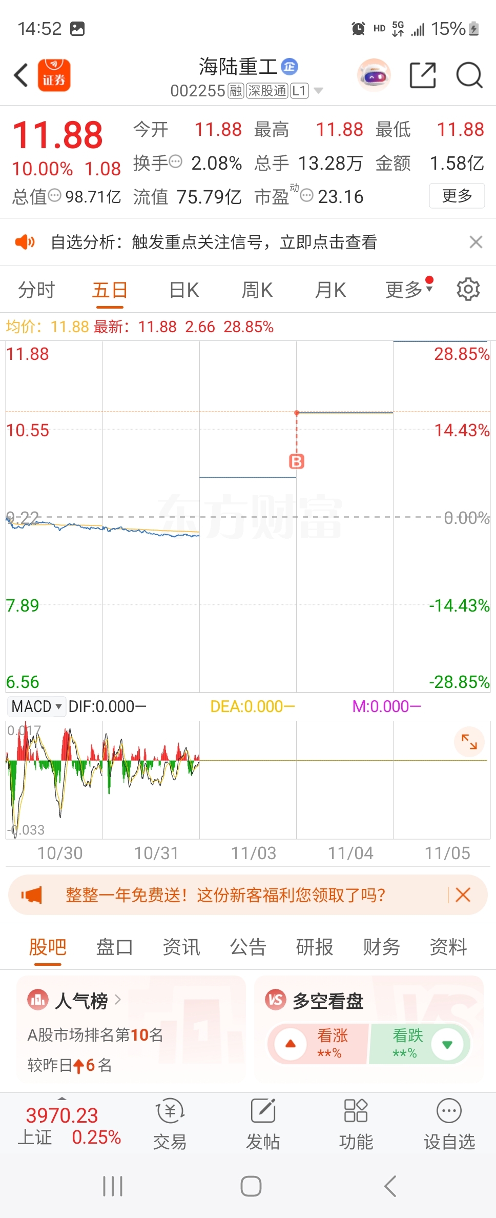$海陆重工(SZ002255)$ 明天看给机会加仓不