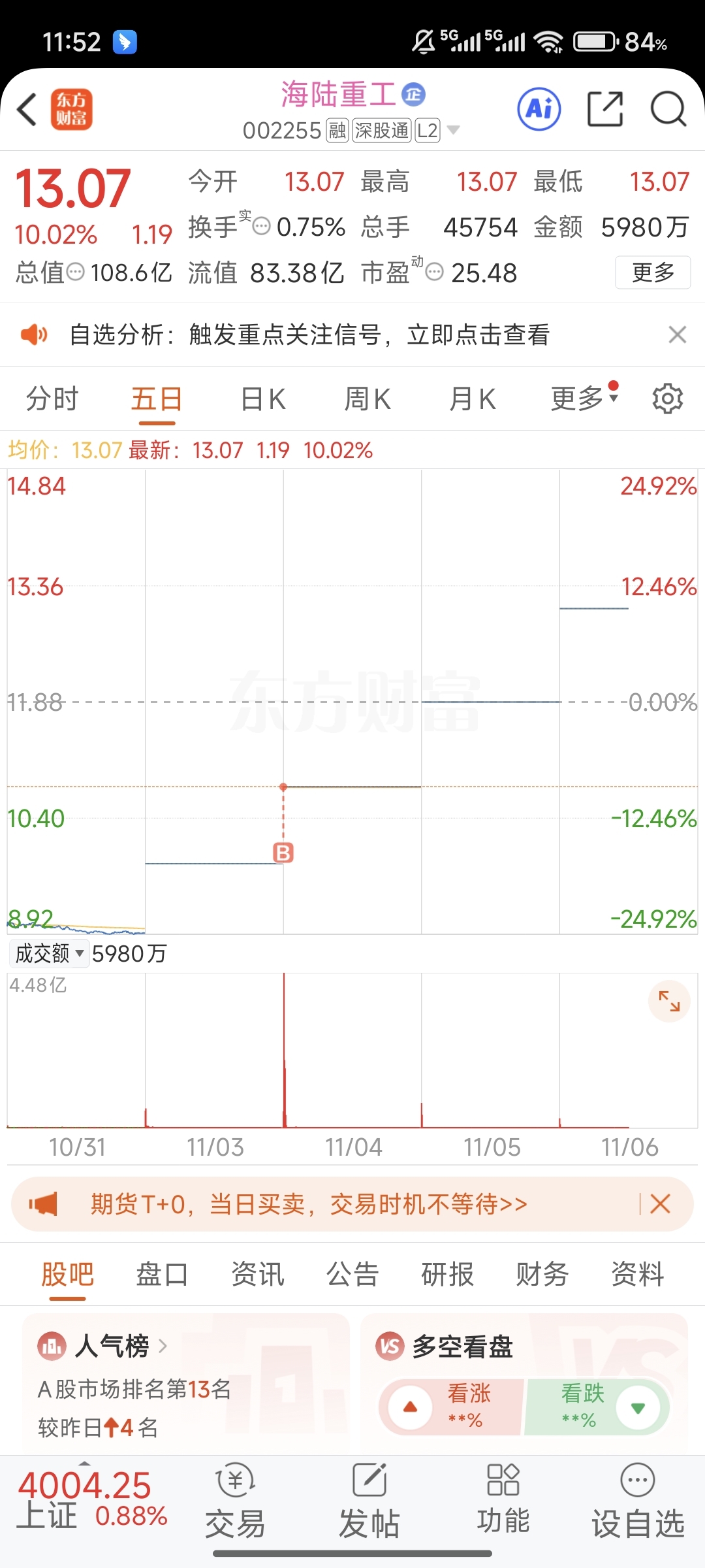 $海陆重工(SZ002255)$ 2板那天没啥钱啊,就买了一点