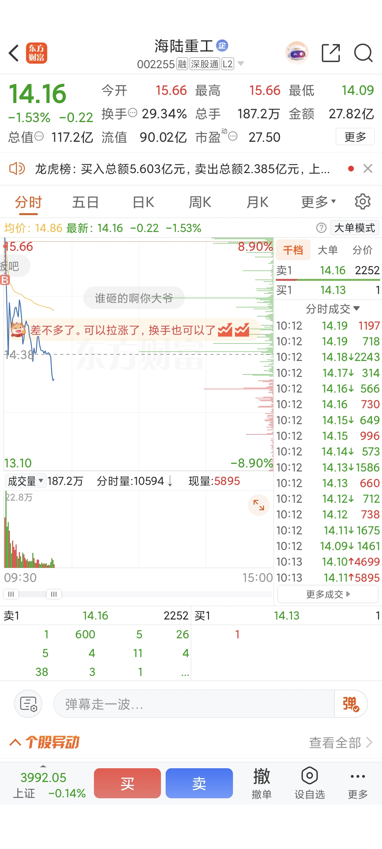 $海陆重工(SZ002255)$ 15.66买的,高高挂在山顶