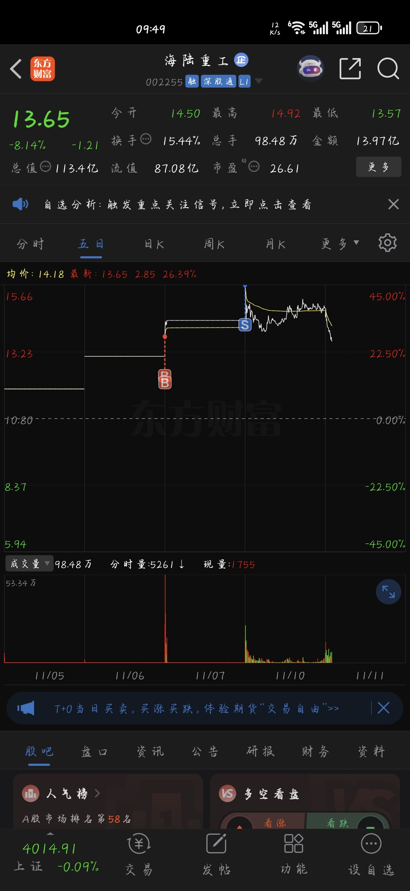 $海陆重工(SZ002255)$ 我知道我买什么股,什么股必跌,所以跑了