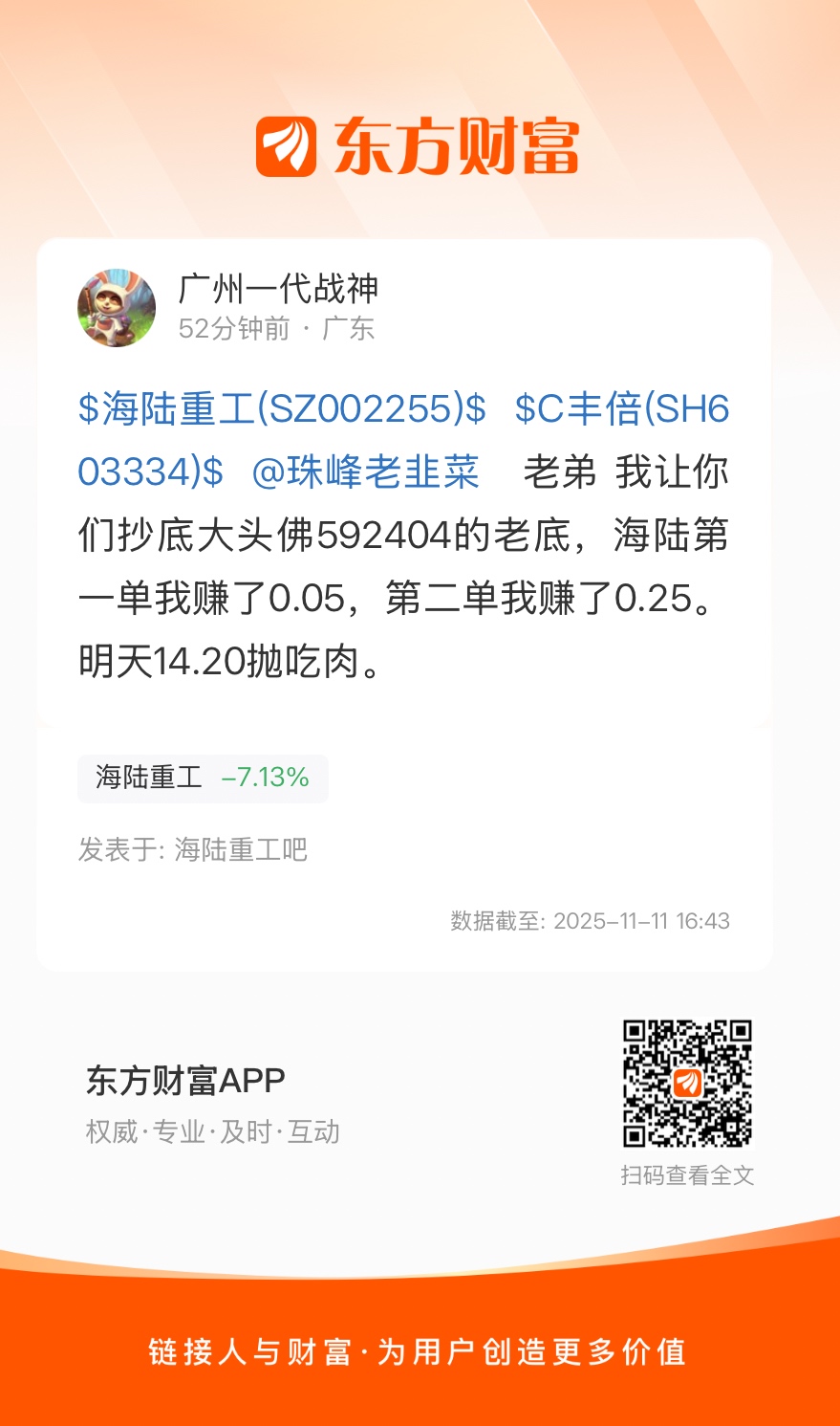 $海陆重工(SZ002255)$ $C丰倍(SH603334)$ @珠峰老韭菜 老弟 我让你们抄底大头佛592404的老底,海陆第一单我赚了0.05,第二单我赚了0.25。 明天14.20抛吃肉。