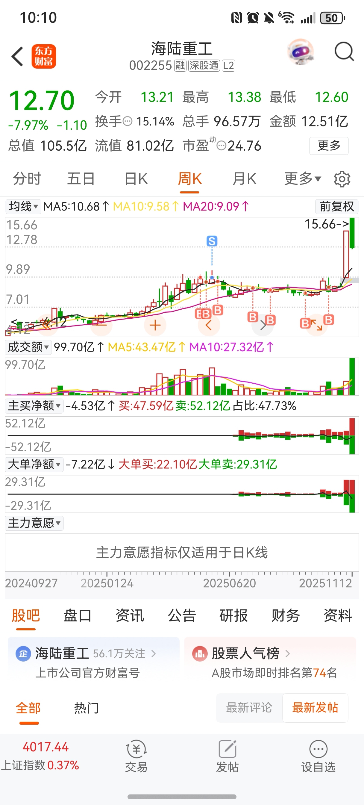 $海陆重工(SZ002255)$ 无所畏惧,继续格局,你今天跌停我再加仓