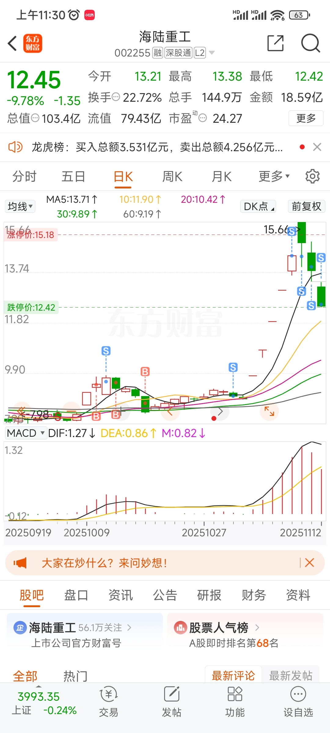 $海陆重工(SZ002255)$ 应该有反弹,14暂时还不是顶,后面会盘整完上18新高,目前先撤大部分了,祝好