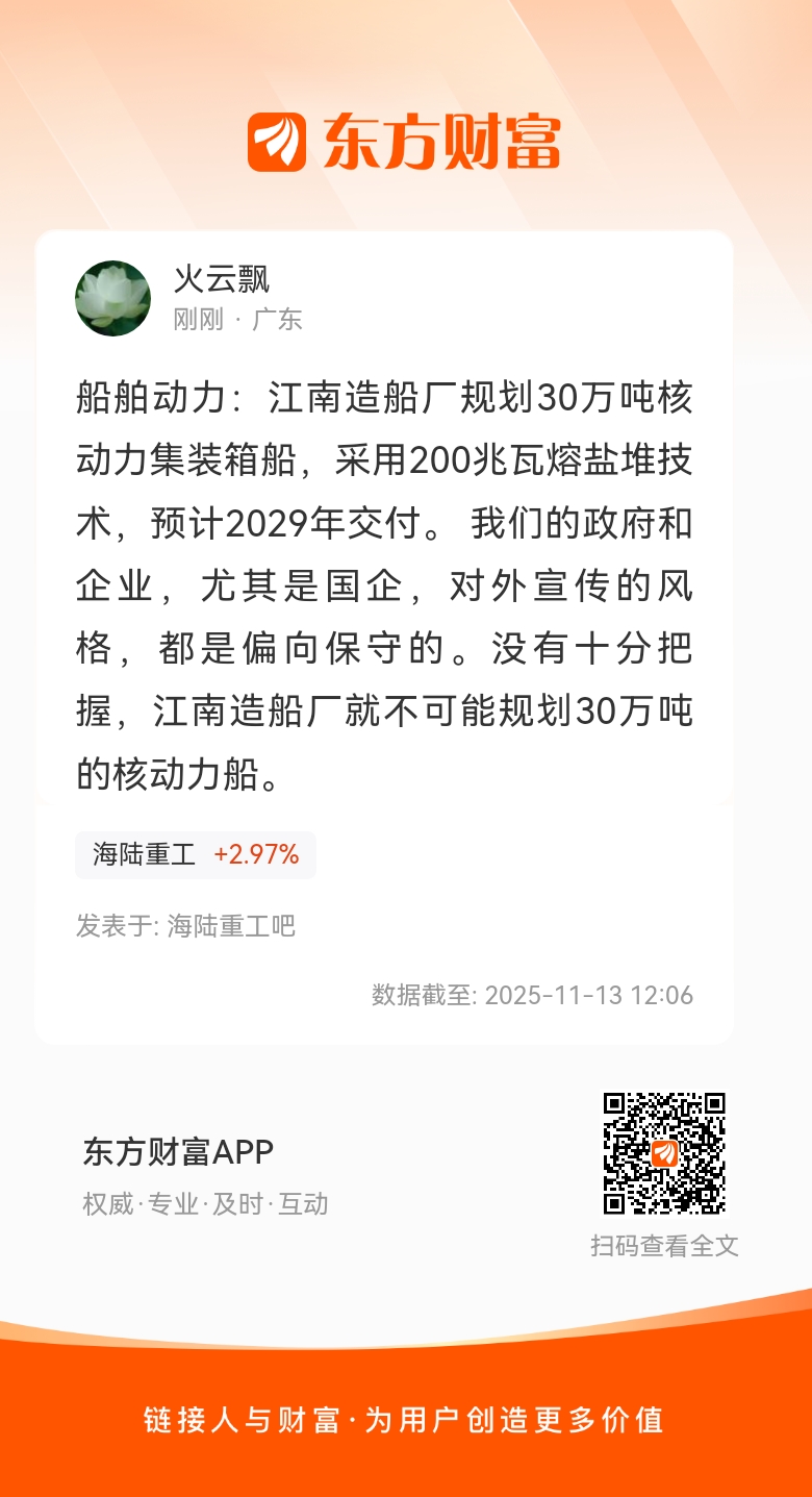 船舶动力:江南造船厂规划30万吨核动力集装箱船,采用200兆瓦熔盐堆技术,预计2029年交付。 我们的政府和企业,尤其是国企,对外宣传的风格,都是偏向保守的。没有十分把握,江南造船厂就不可能规划30万吨的核动力船。