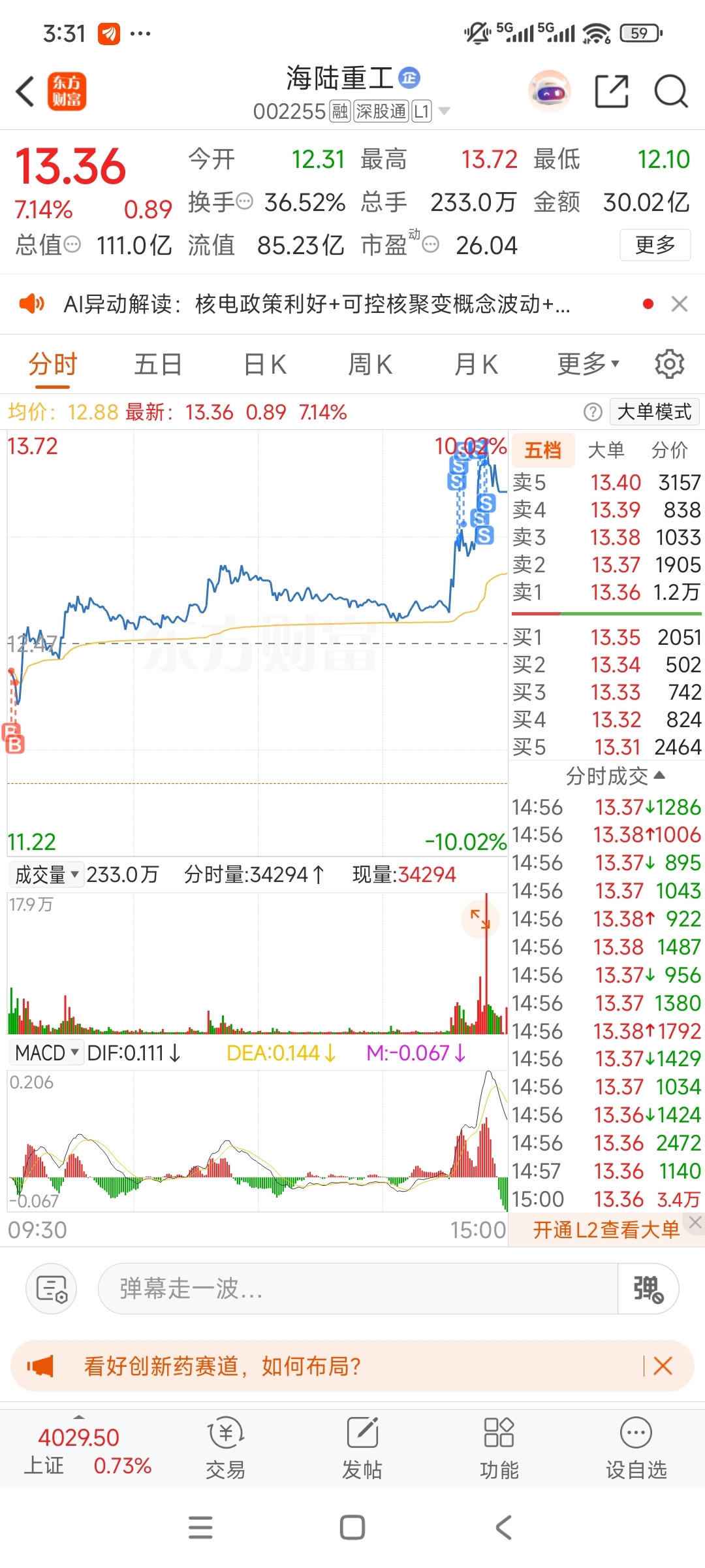 $海陆重工(SZ002255)$ 海陆重工这个股票我昨天有没有让大家大胆进场补仓买,无脑买,越低越买。关注我的朋友都应该知道啊,现在说什么都晚了,看看我今天的t漂亮吗?涨停的时候我可是卖出去了哟。