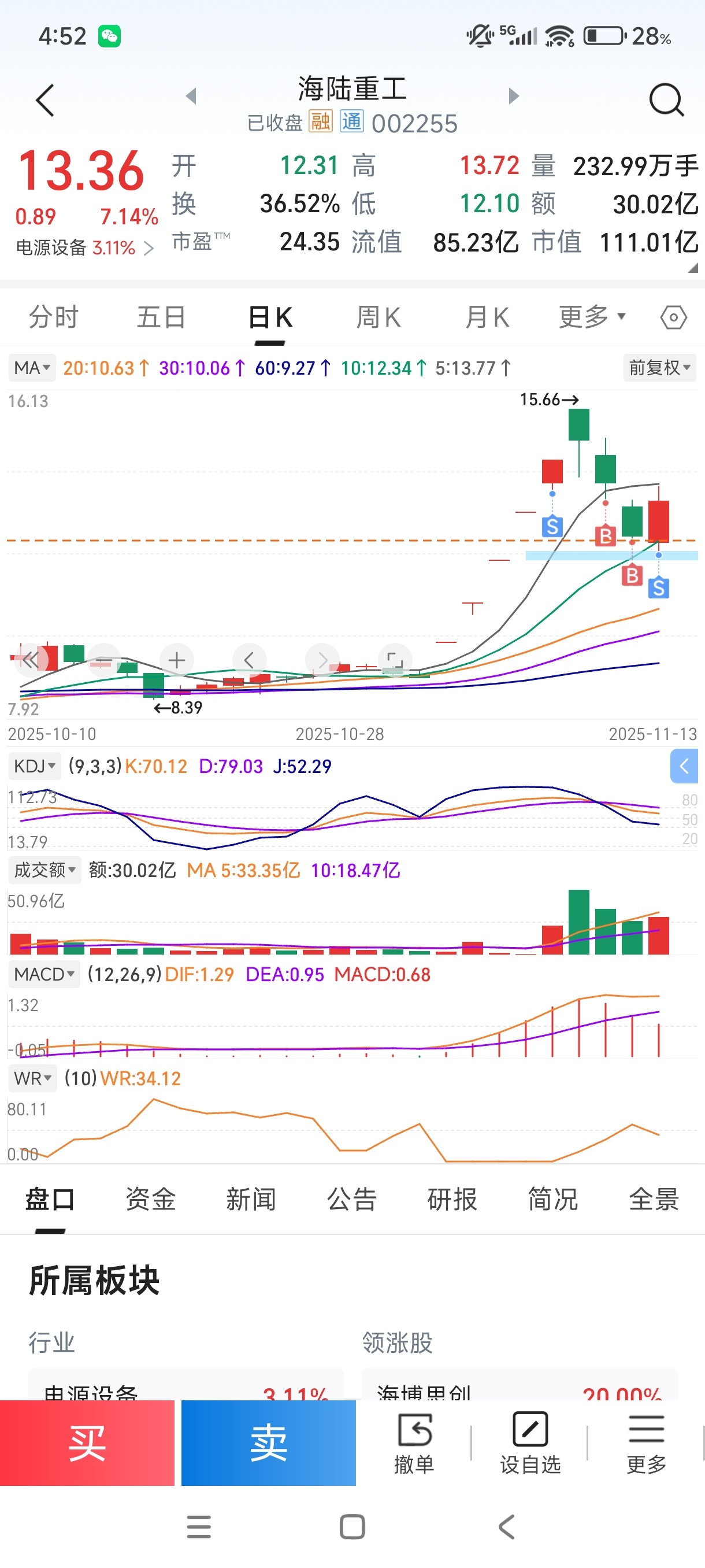 $海陆重工(SZ002255)$ 今天算是一年来操作最成功的一次了,留了半仓,希望明天好运